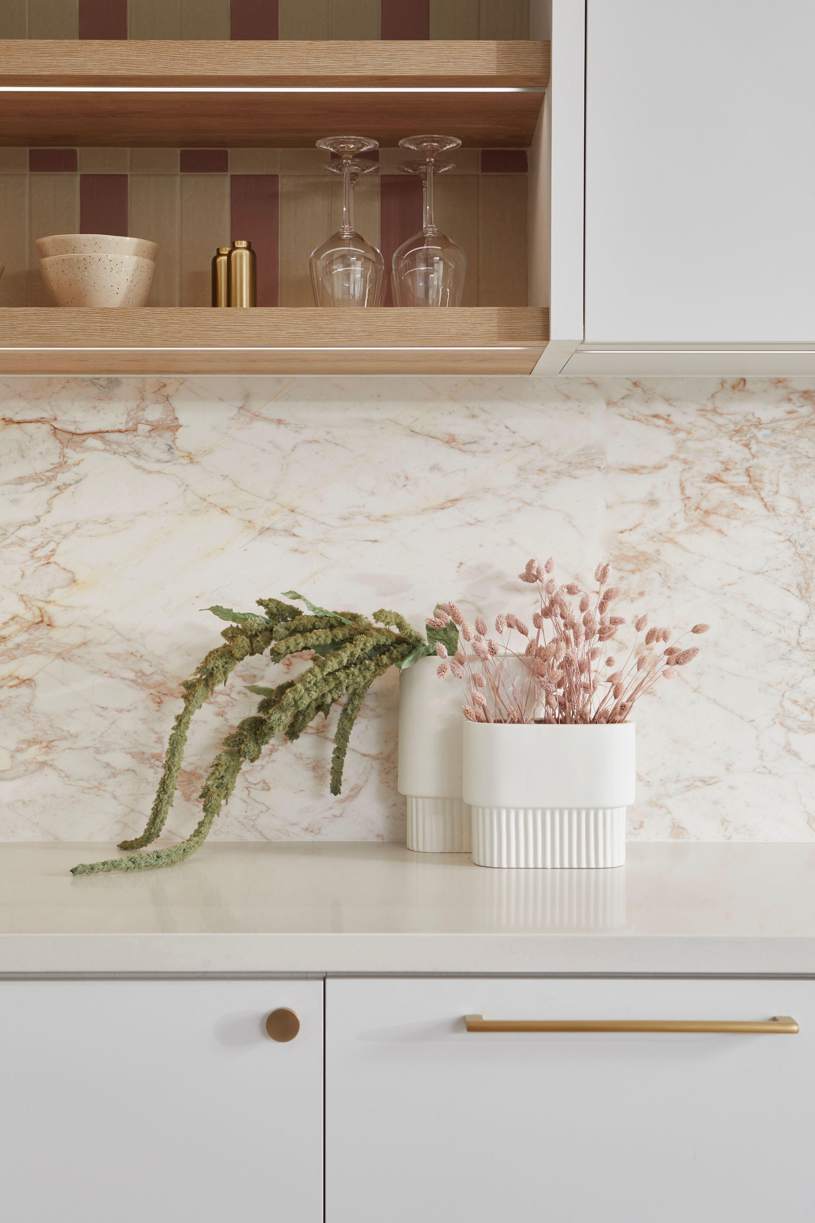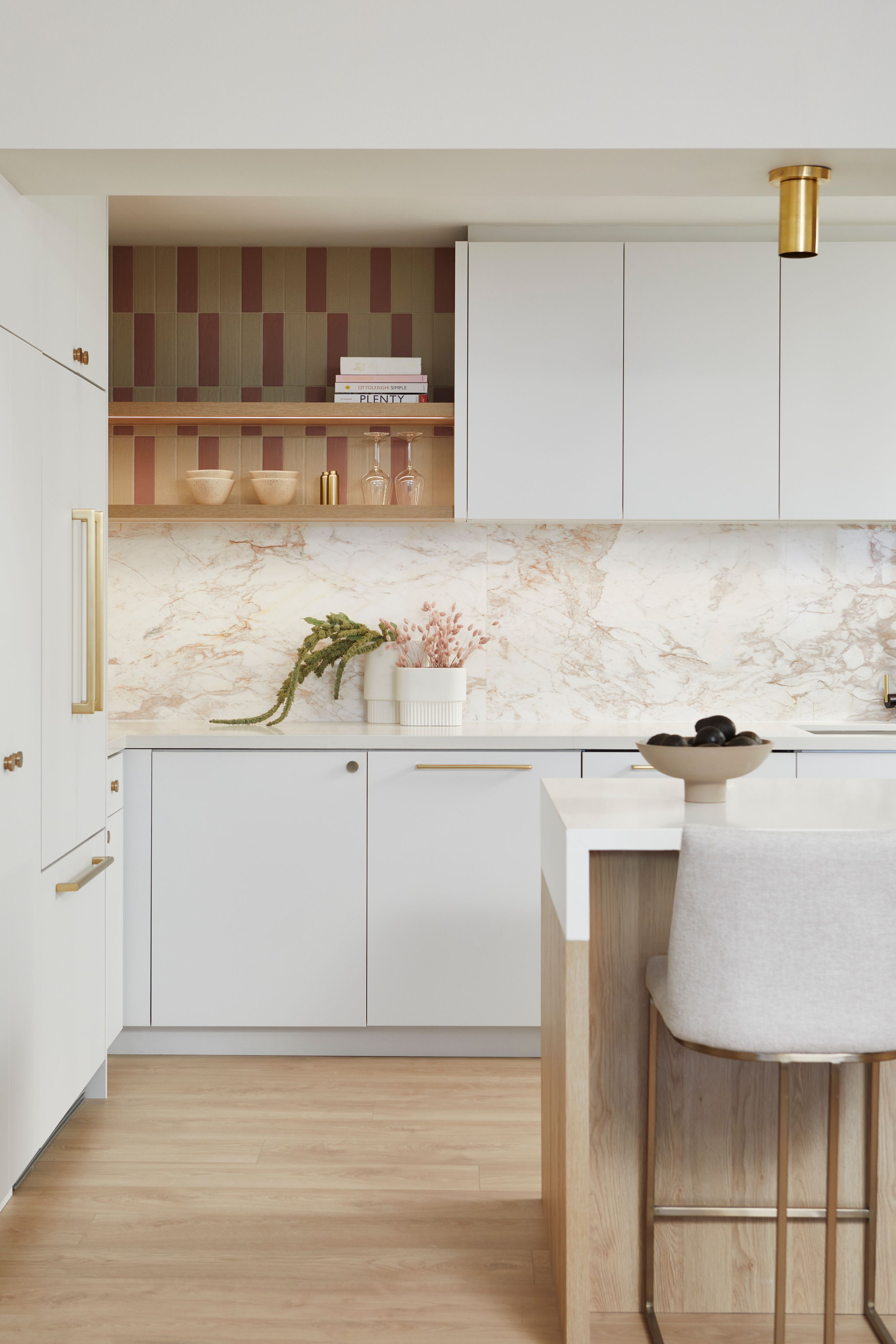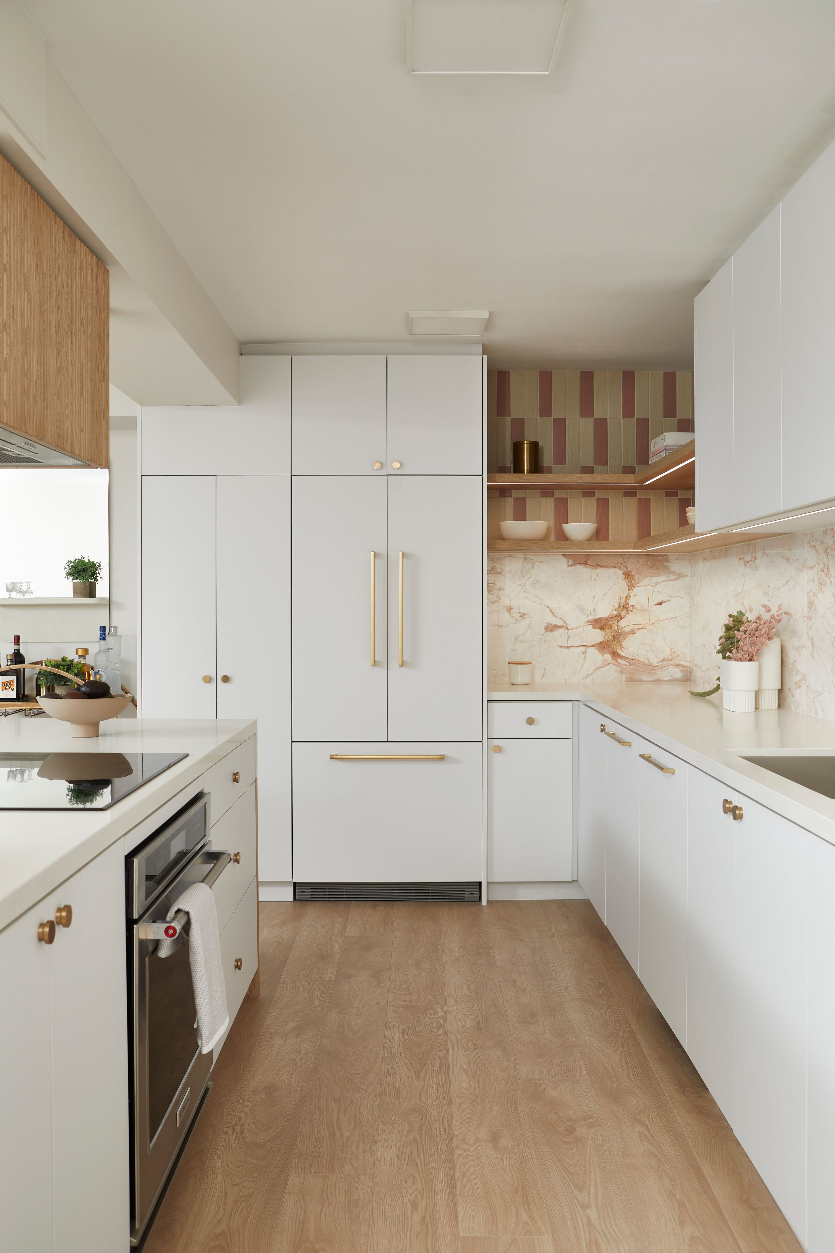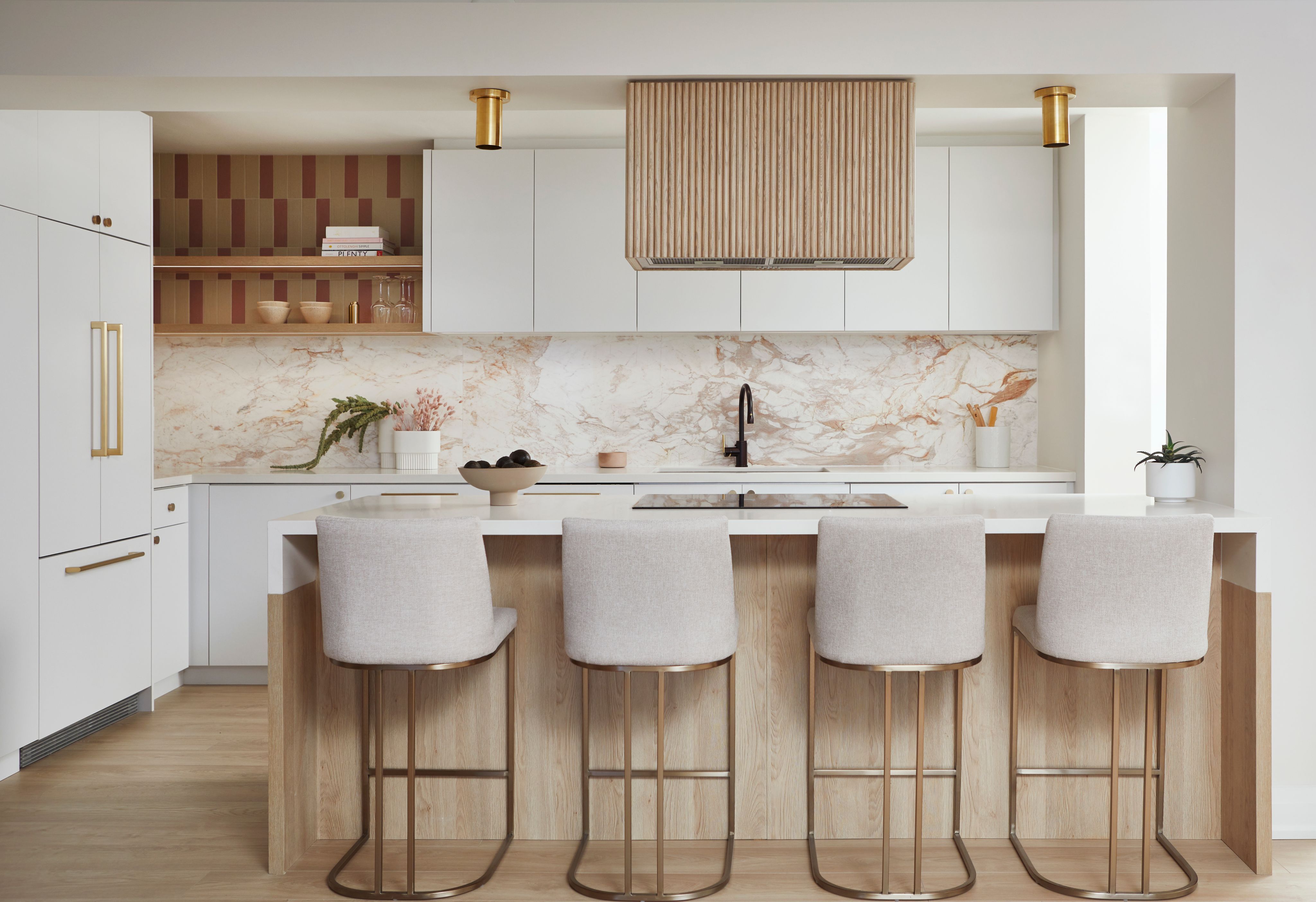 We elevated the kitchen's aesthetic with full-height cabinetry, a mix of floating shelves, integrated appliances, and a reeded hood fan cover that served as a captivating focal point. To infuse the space with character and charm, we incorporated a variety of finishes, including natural Calacatta marble for the backsplash, two-tone tile accents at the open shelves, and white oak wood elements throughout.