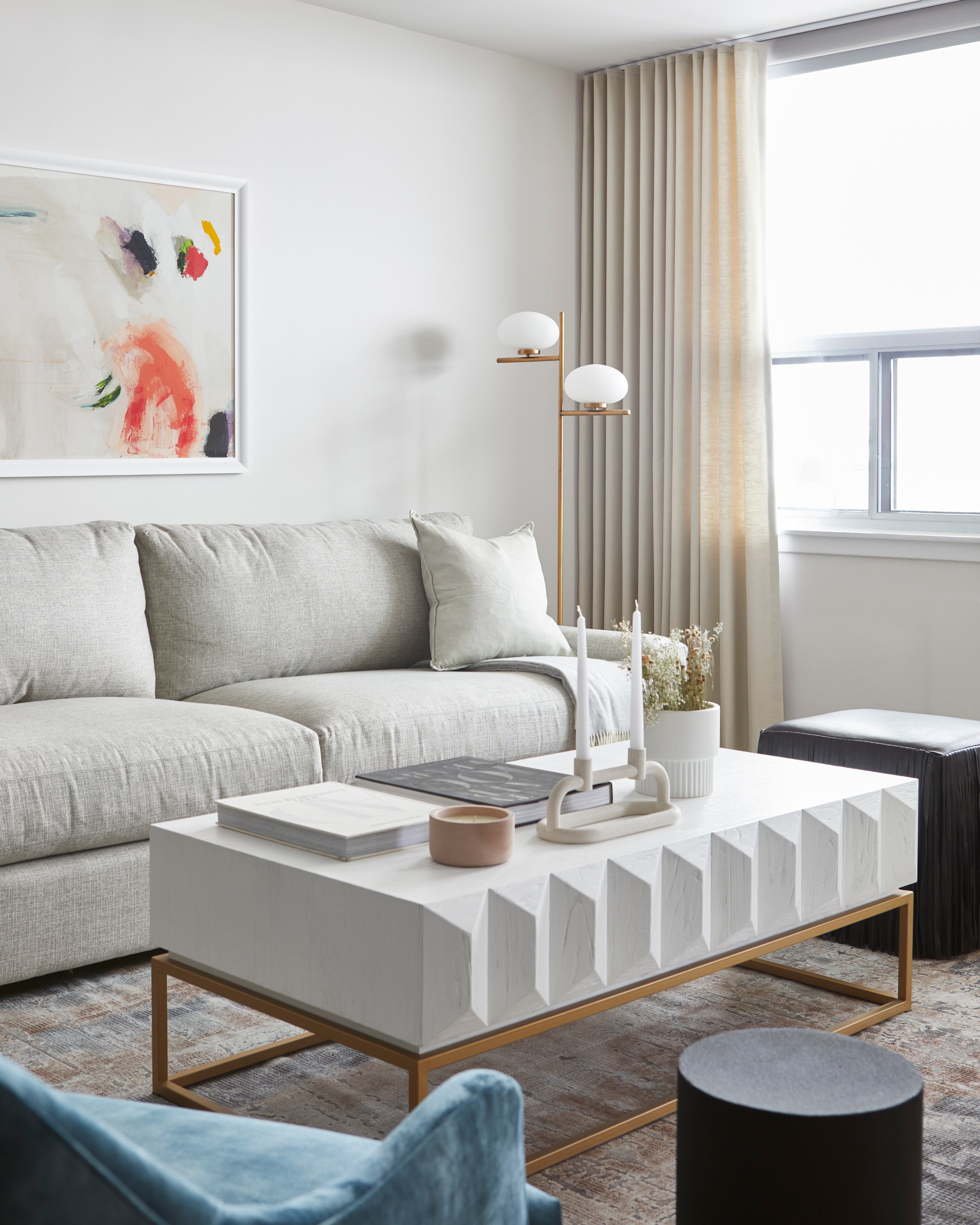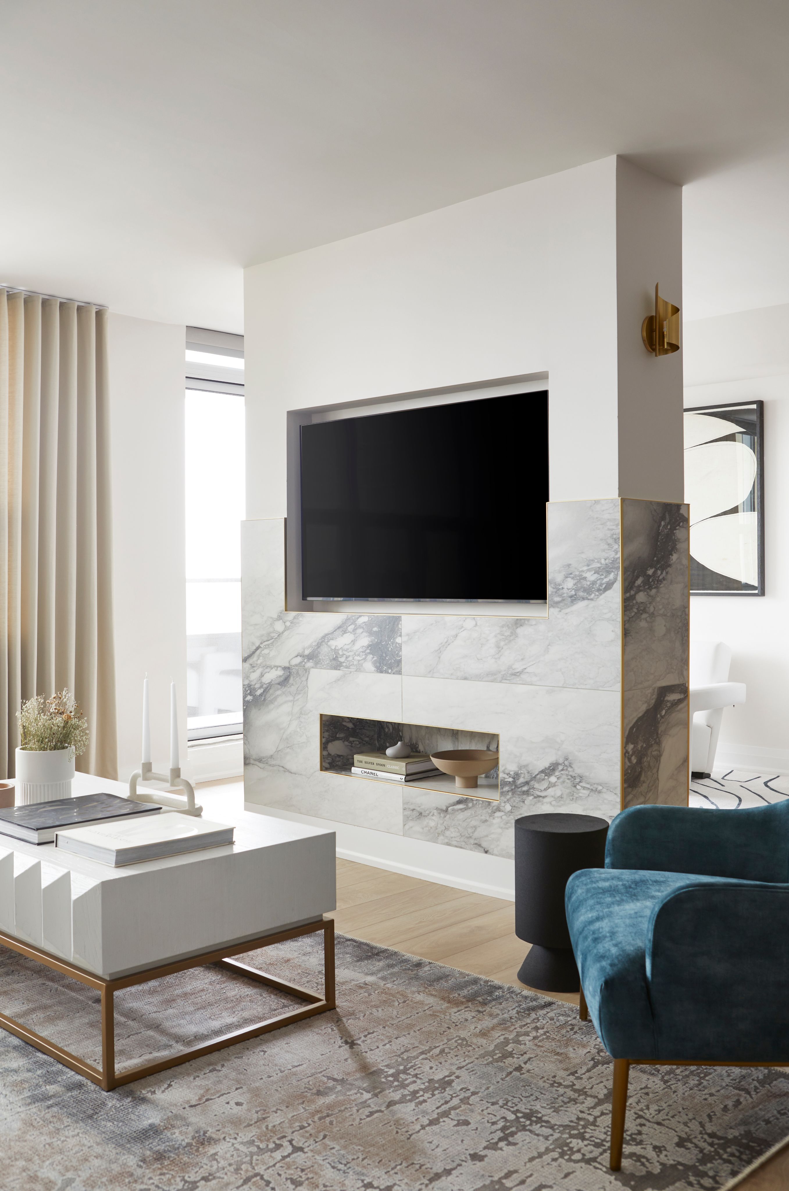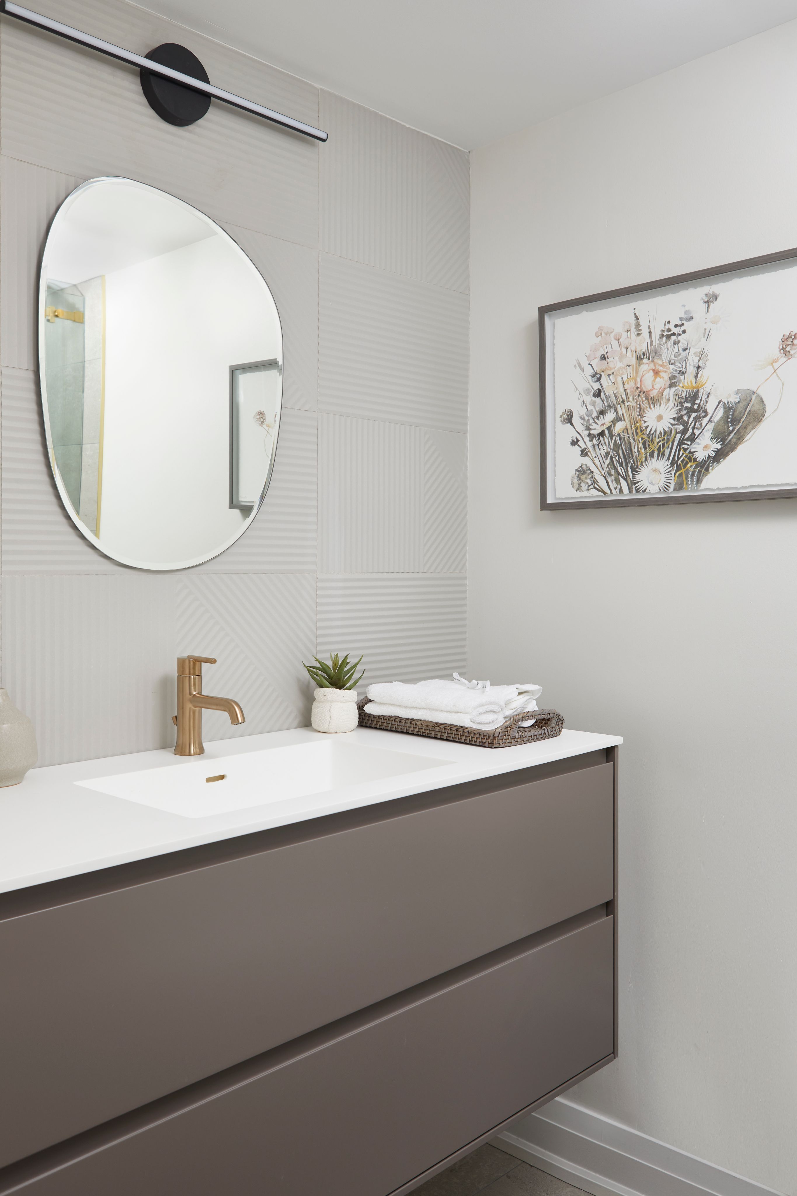 In the bathrooms, statement tiles and fluting details were introduced to enhance texture and dimension, adding a touch of luxury to these intimate spaces. To complete the transformation, we applied warmer paint tones, installed custom drapery, and curated a selection of contemporary furniture pieces to harmonize with the modern aesthetic of the interior.