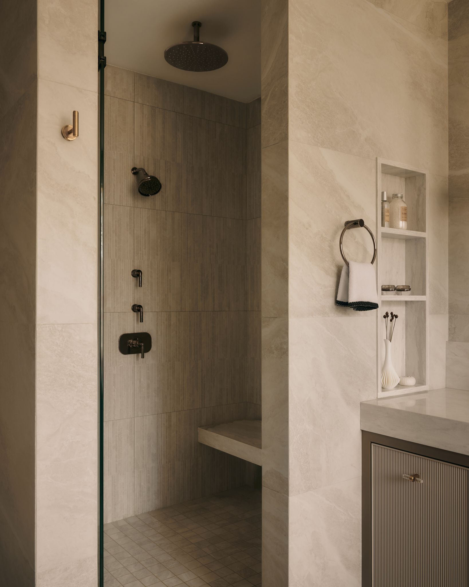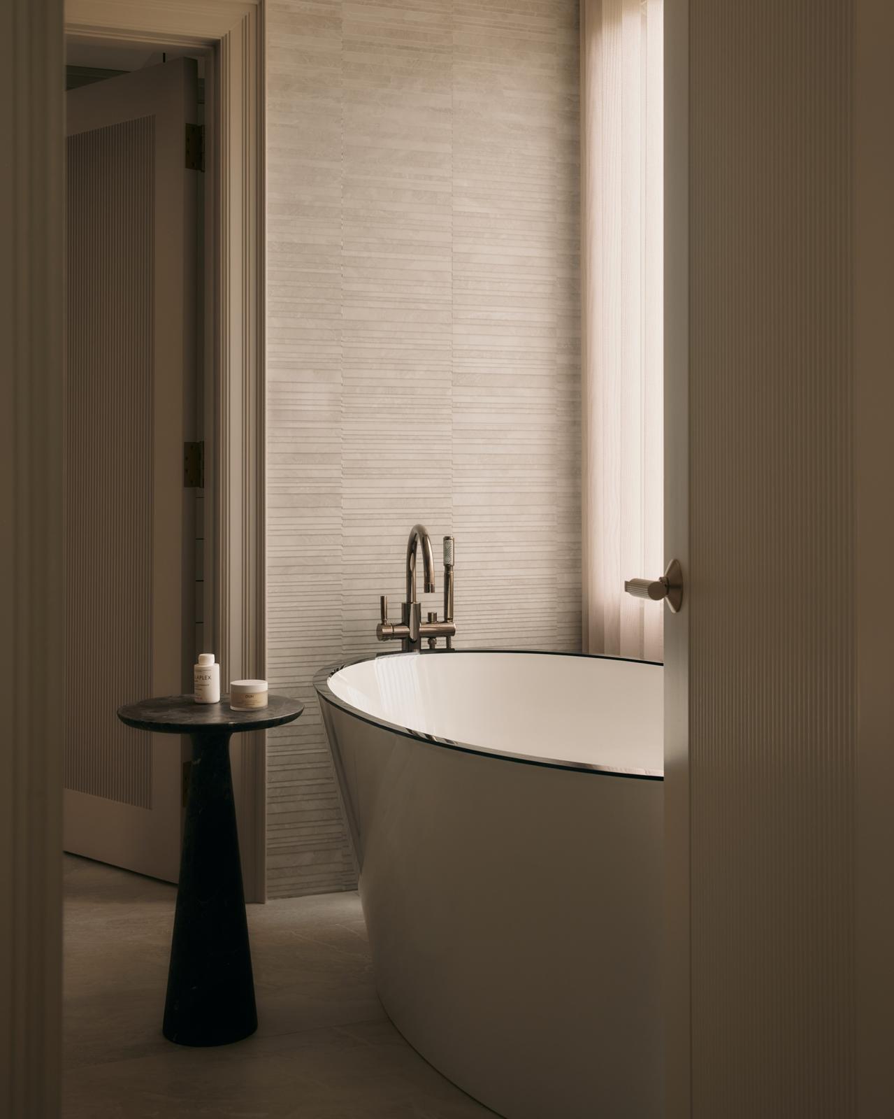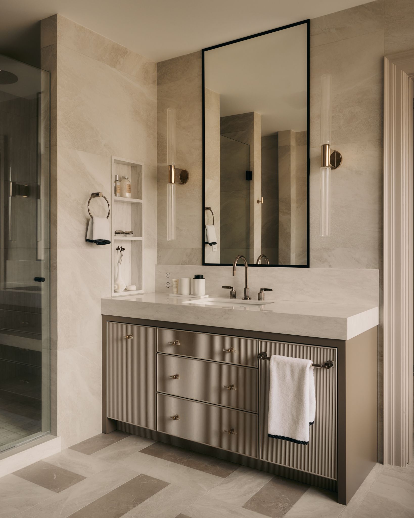 Layers of pattern and texture were introduced through thoughtful tilework, reeded cabinetry complimented with textured wallpaper and fabric-rich materials like velvets, fringe and silks. The result; a grand suite crafted to engage the senses while maintaining a warm and inviting atmosphere.