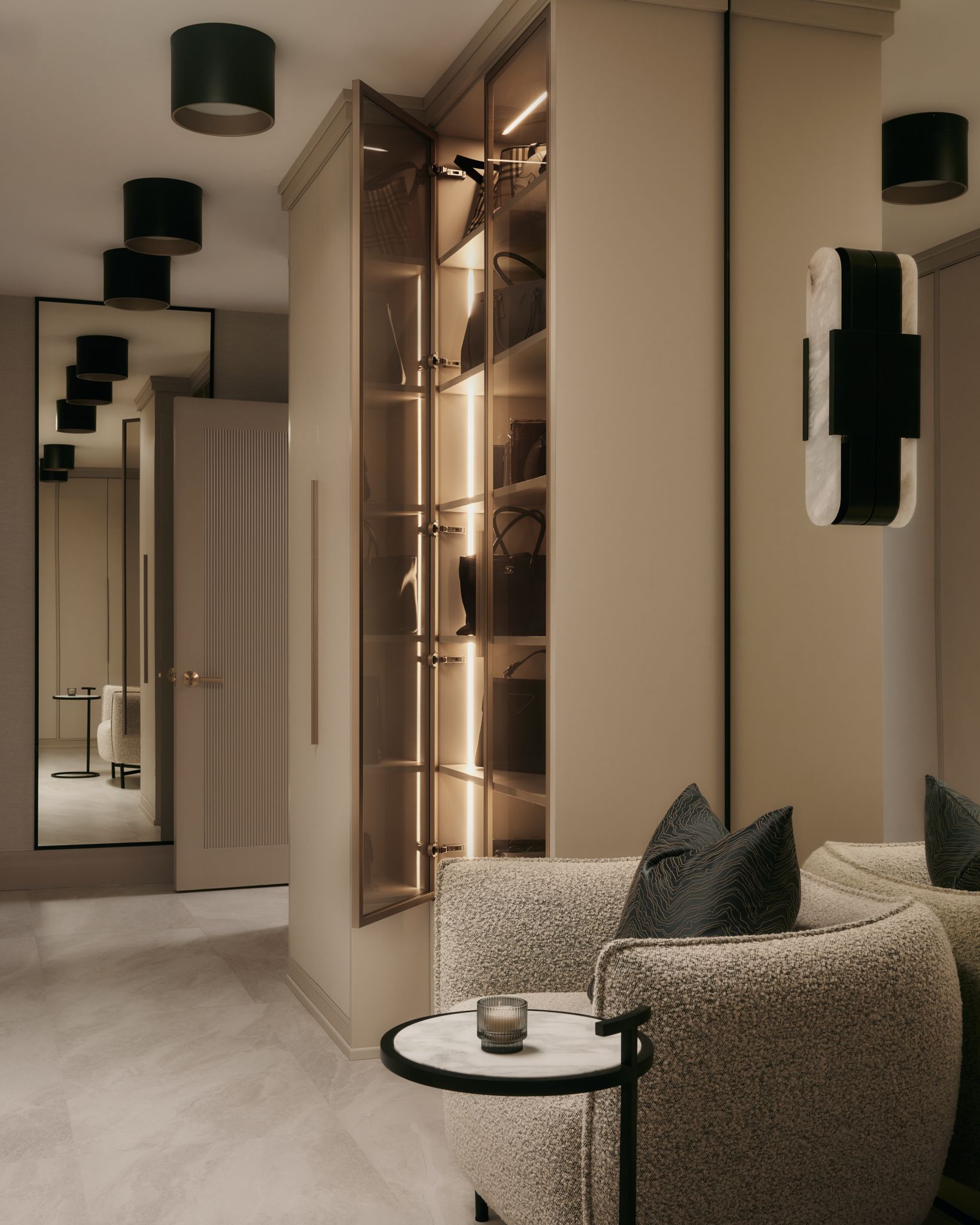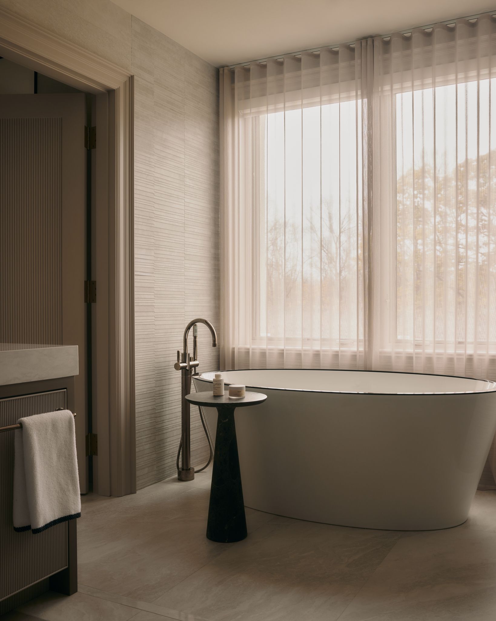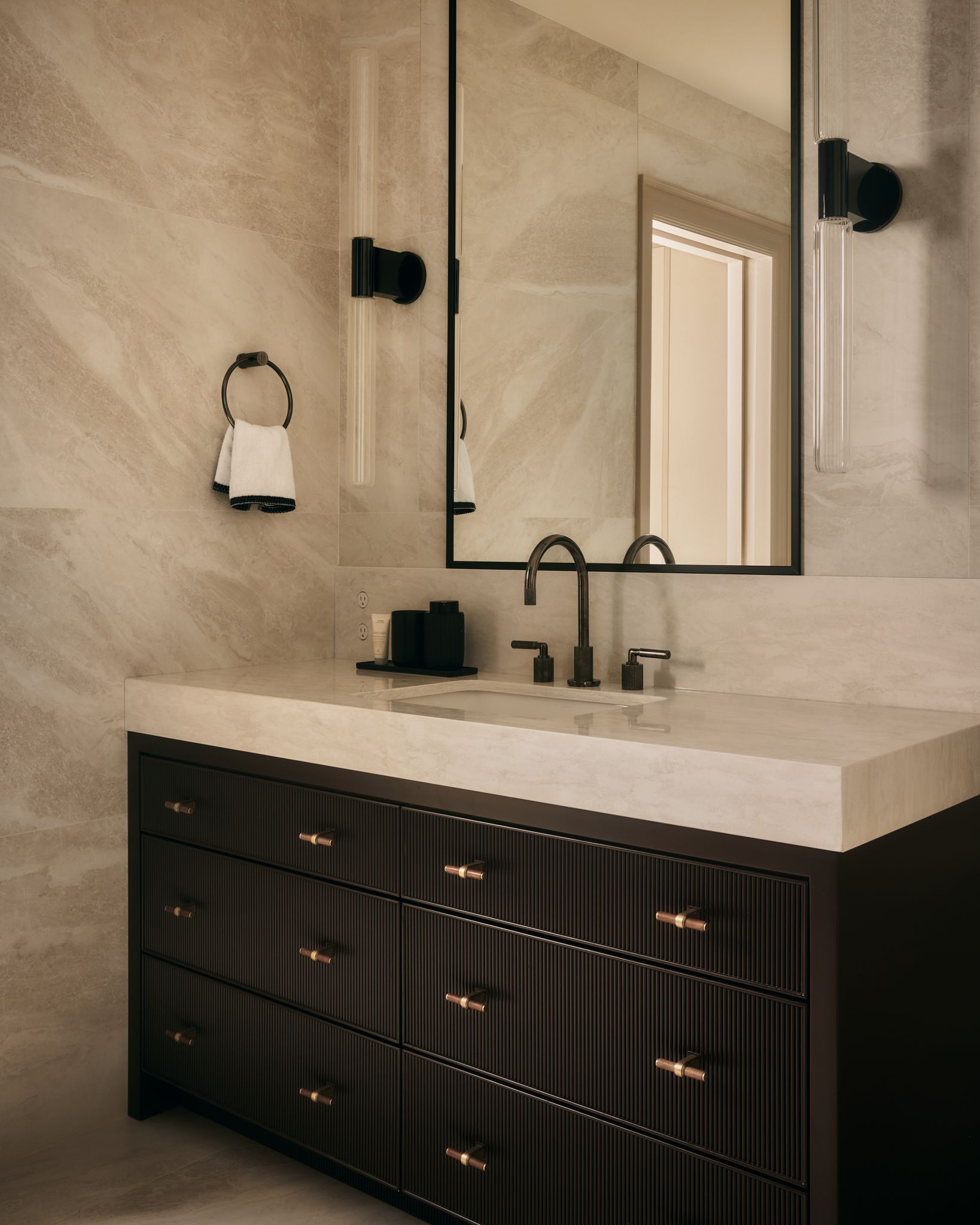 Layers of pattern and texture were introduced through thoughtful tilework, reeded cabinetry complimented with textured wallpaper and fabric-rich materials like velvets, fringe and silks. The result; a grand suite crafted to engage the senses while maintaining a warm and inviting atmosphere.