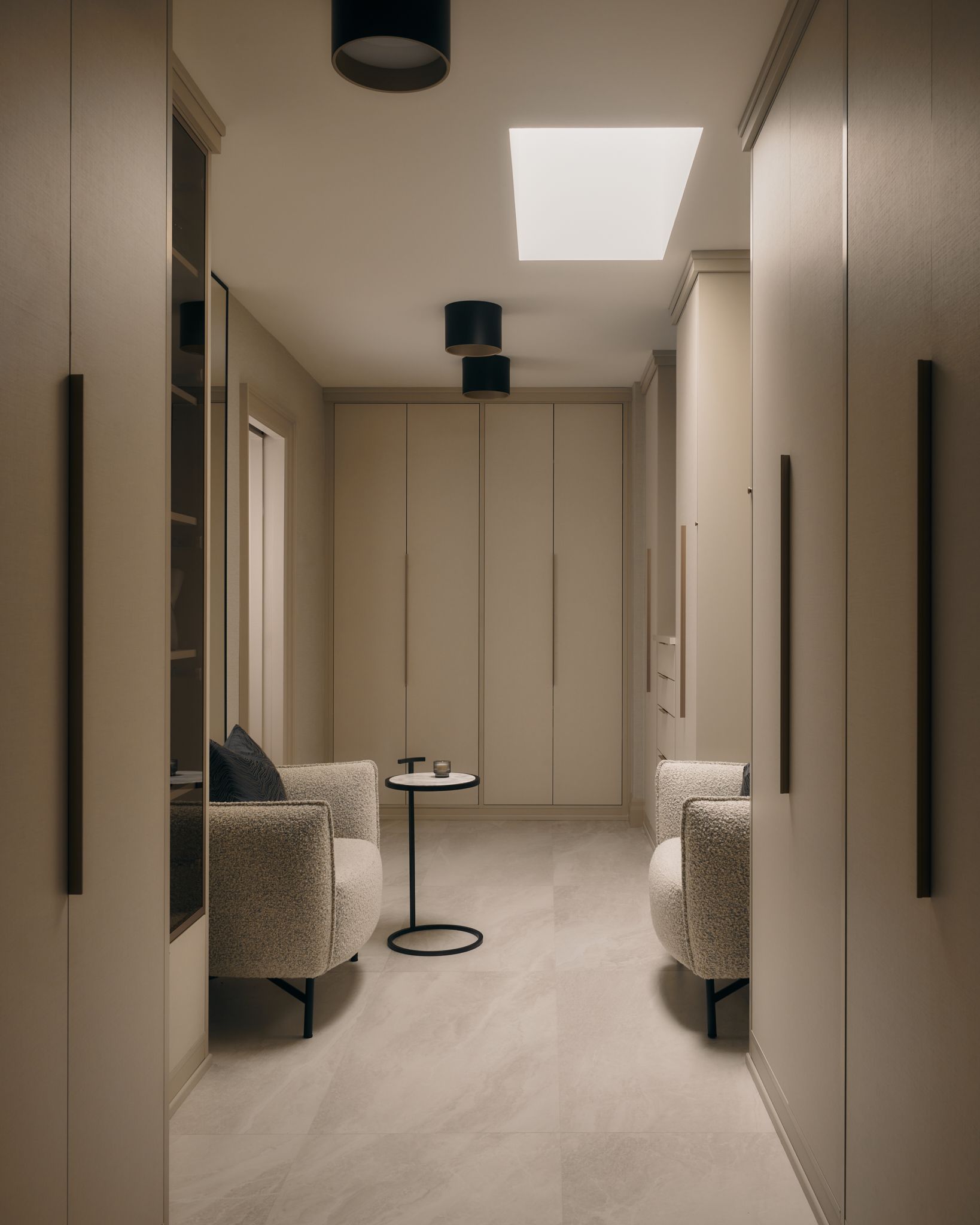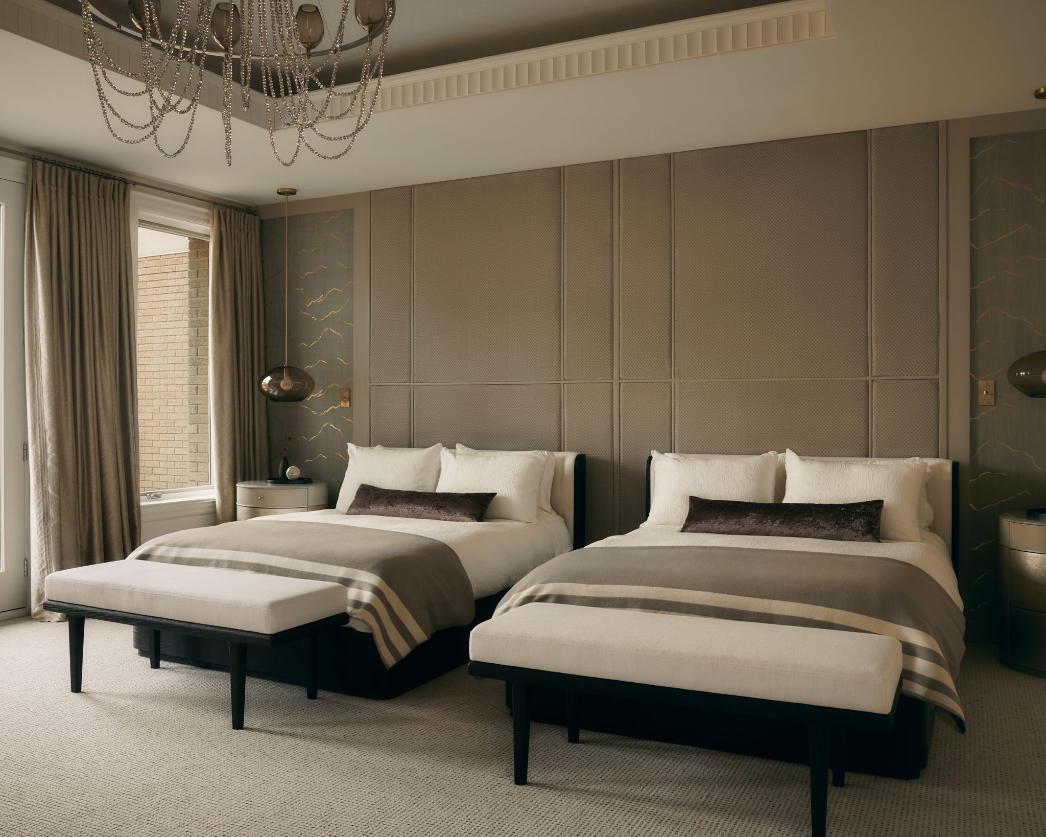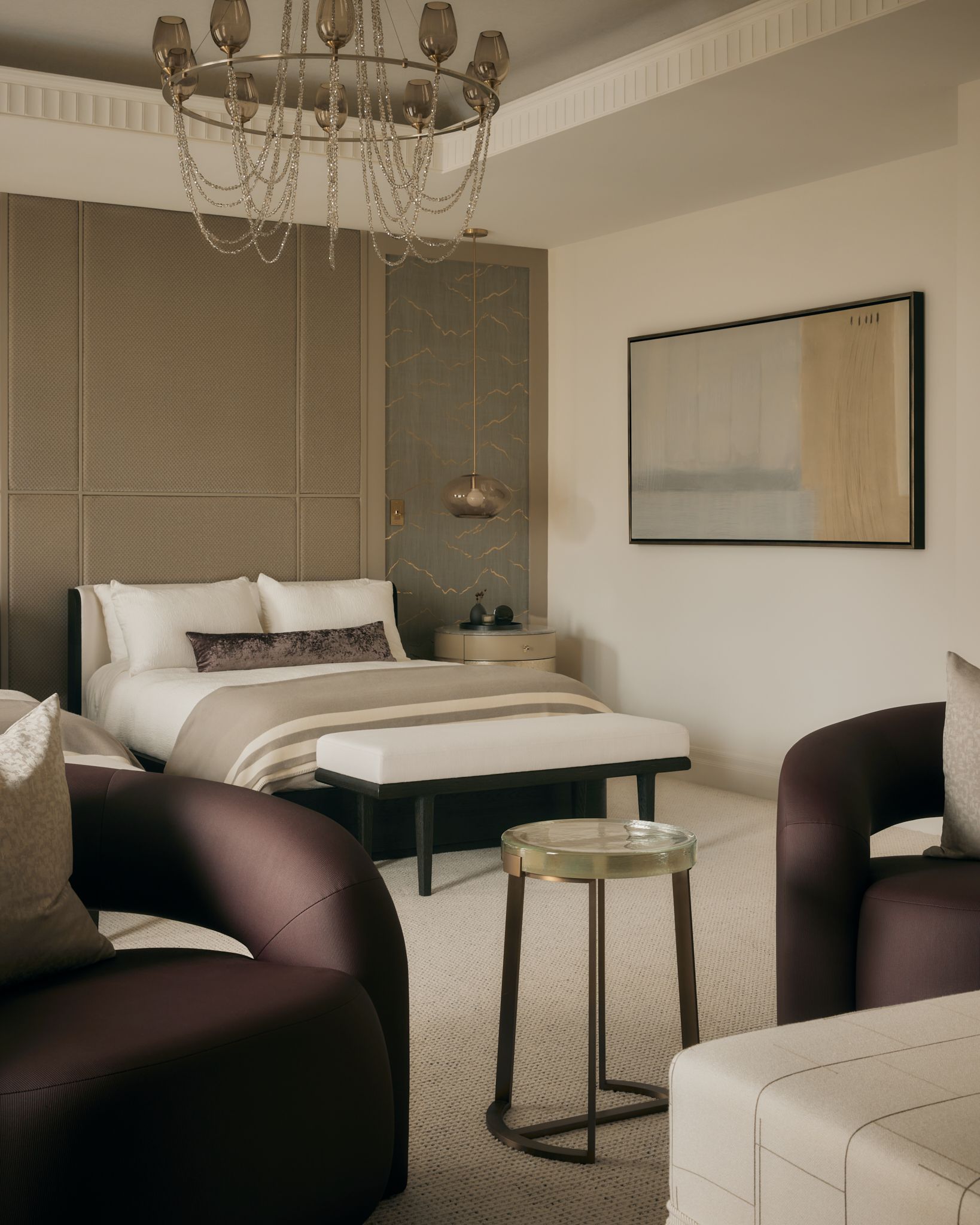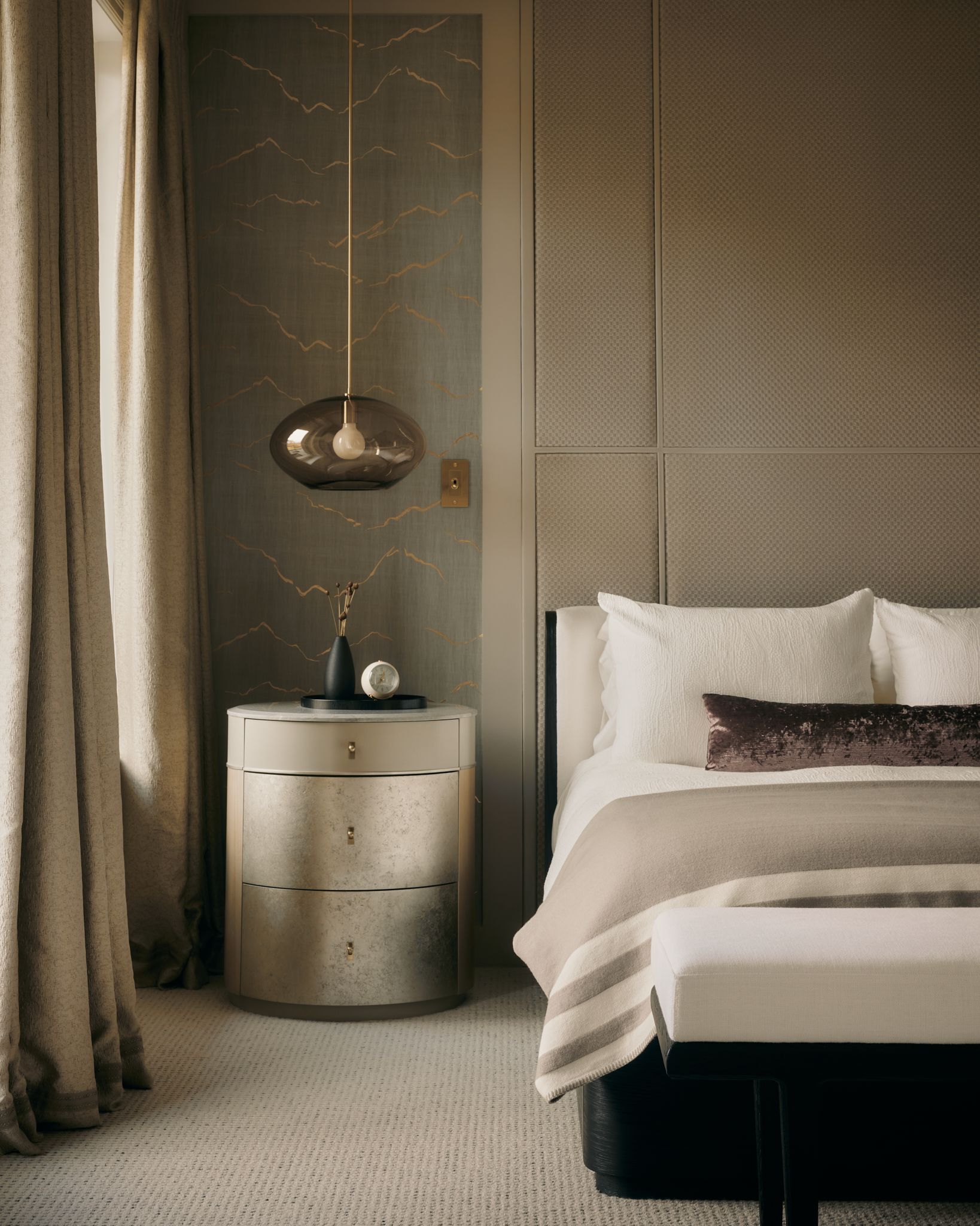 Every element was fully customized from the full-height tailored headboard with inset gold-leaf wallpaper, to the bespoke lighting and luxurious plumbing fixtures, including a steam shower and hydrotherapy tub.