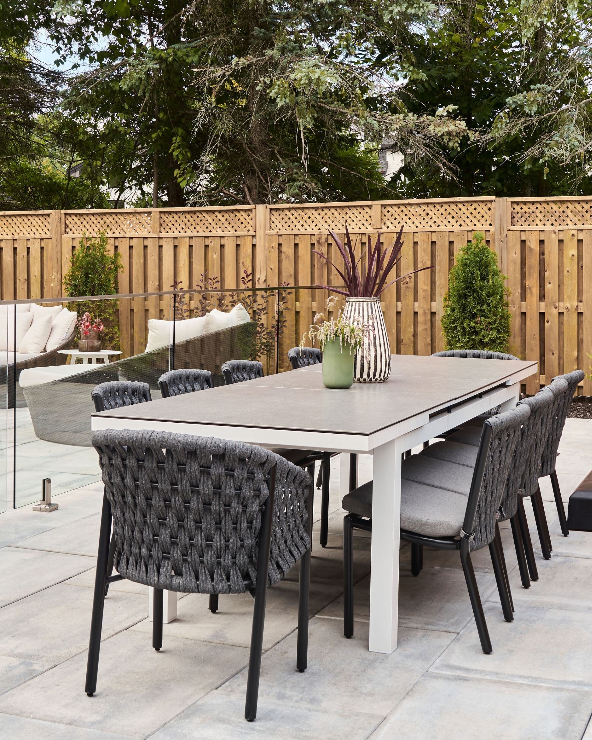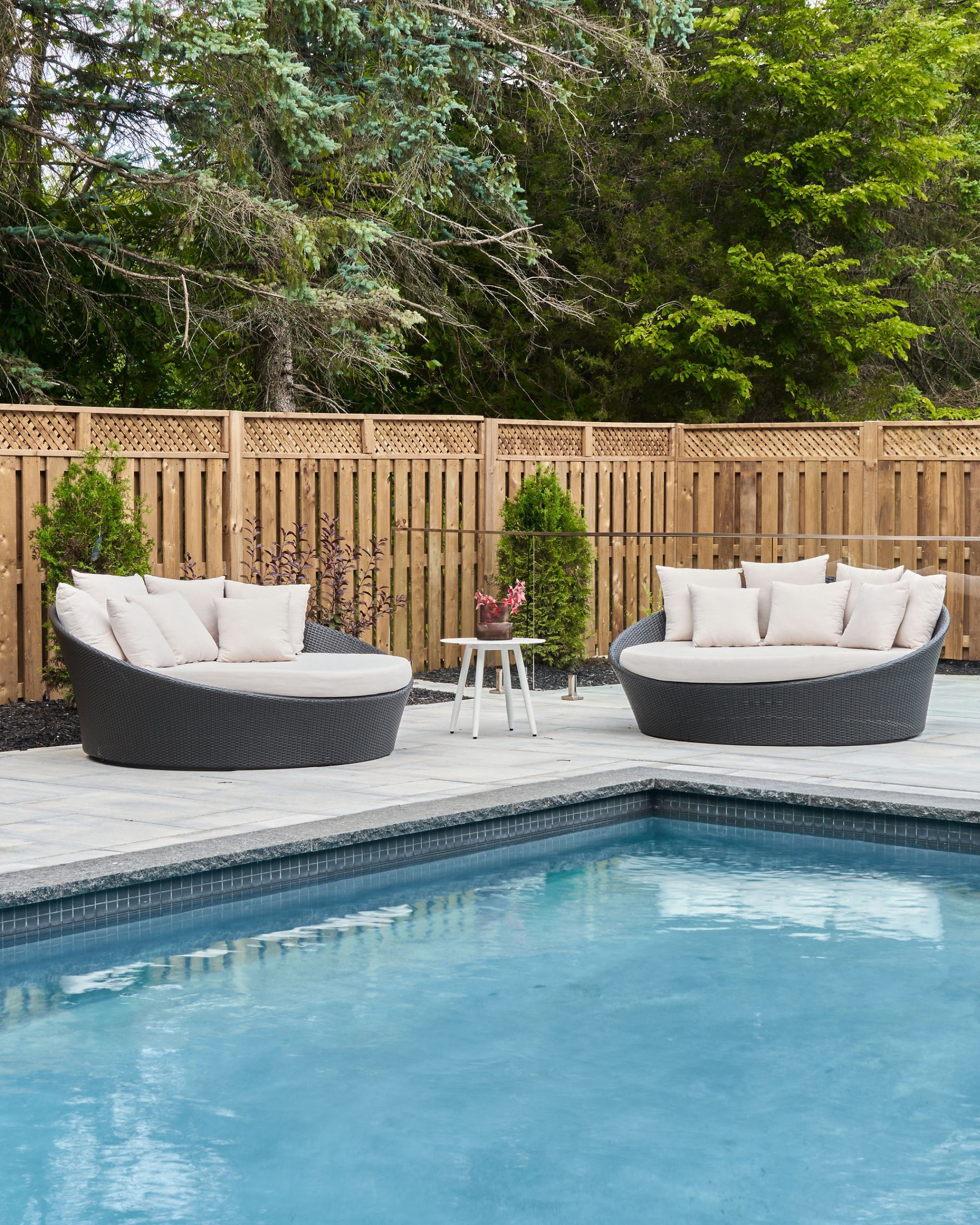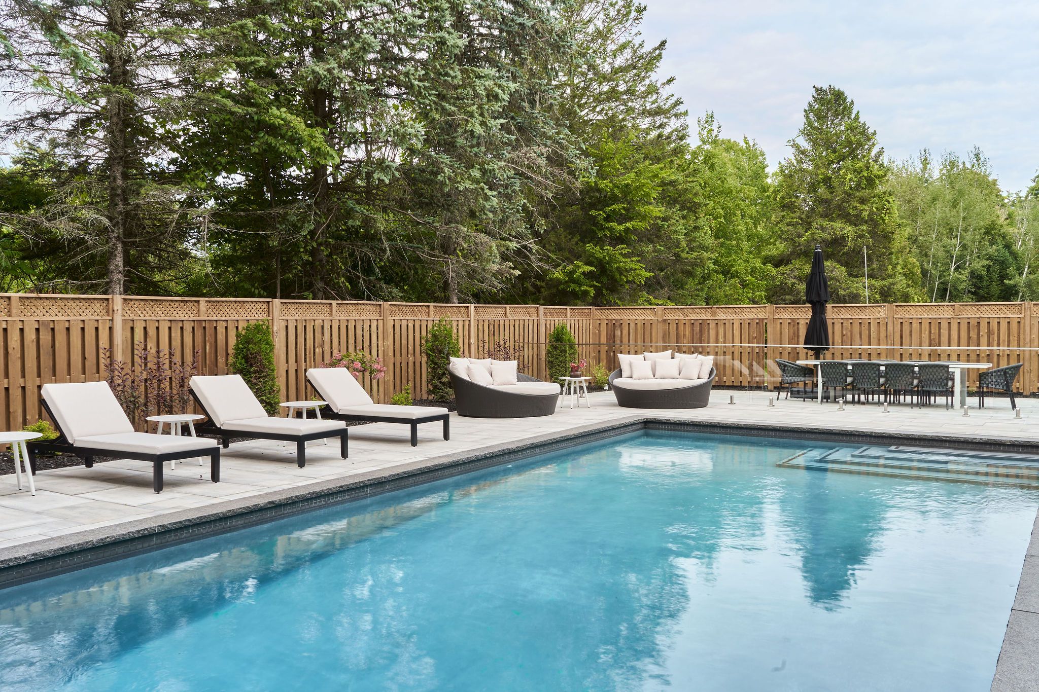 Outside, the pool serves as a central hub for outdoor living, seamlessly extending the interior space. With ample seating options and a relaxed atmosphere, including large daybeds and multiple chaises, the outdoor area offers the perfect retreat for unwinding and enjoying leisurely poolside moments.