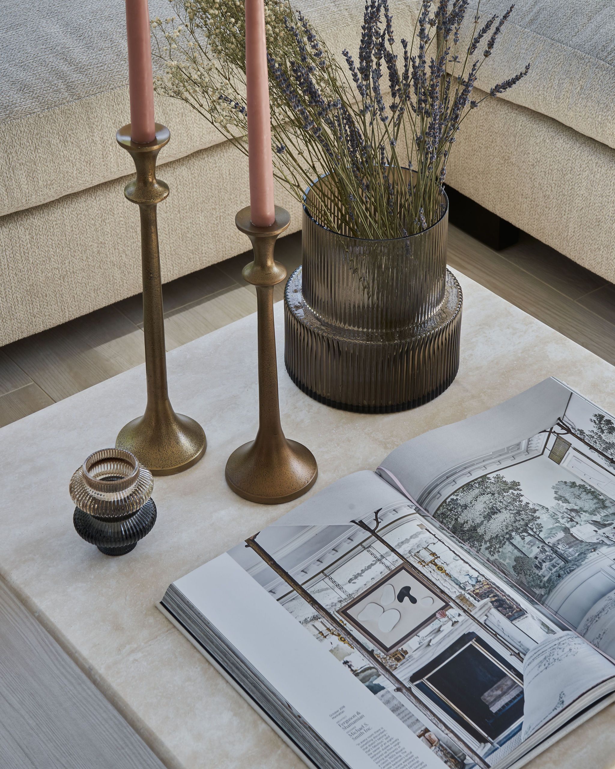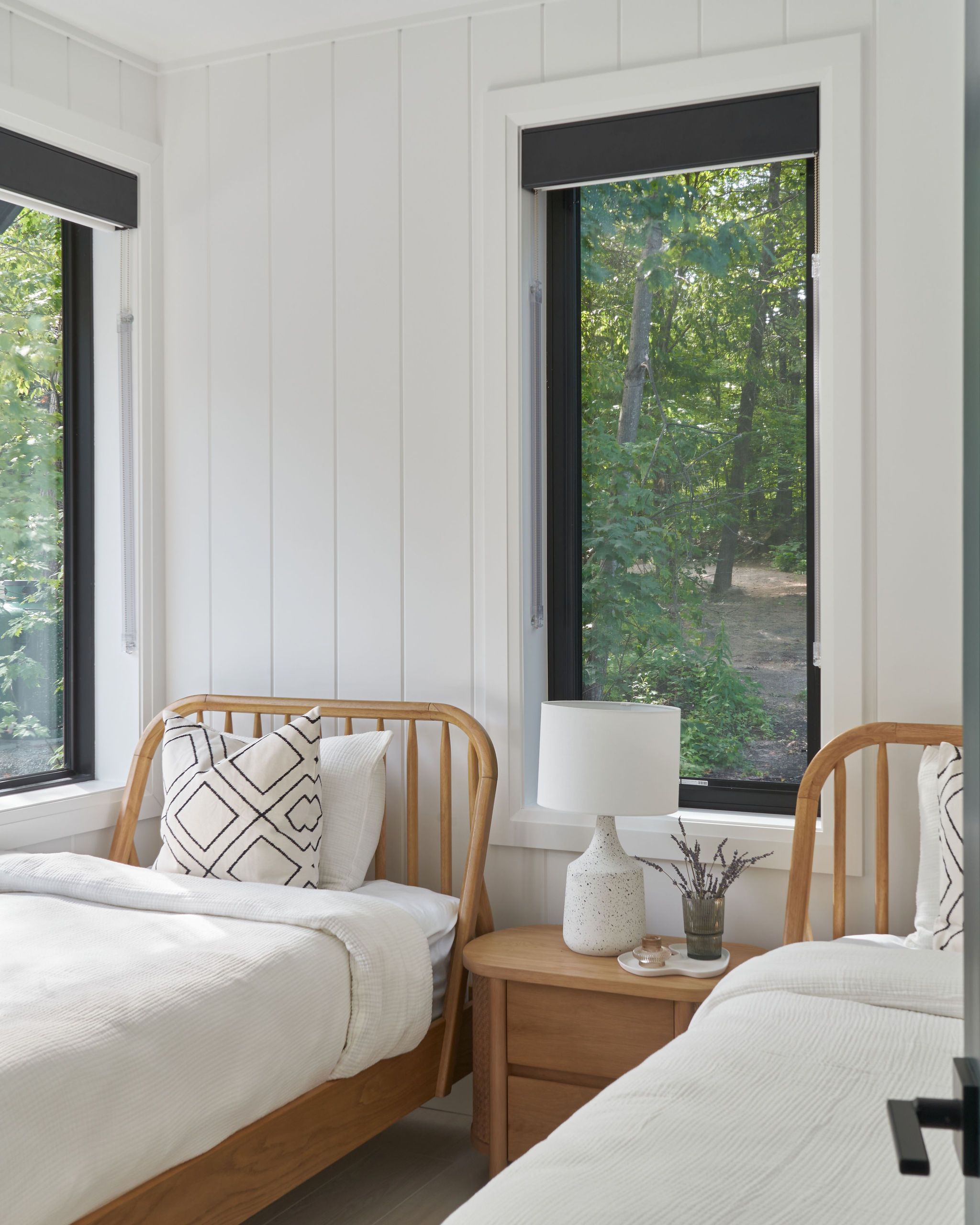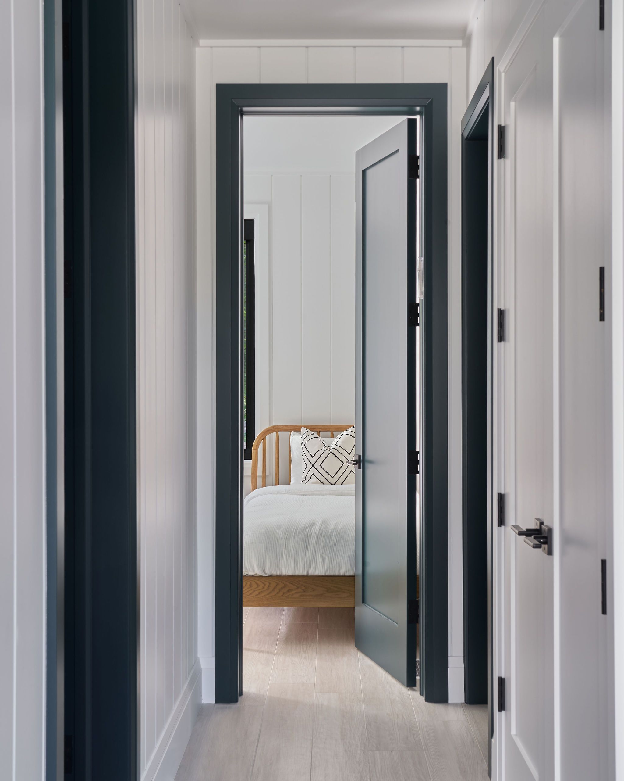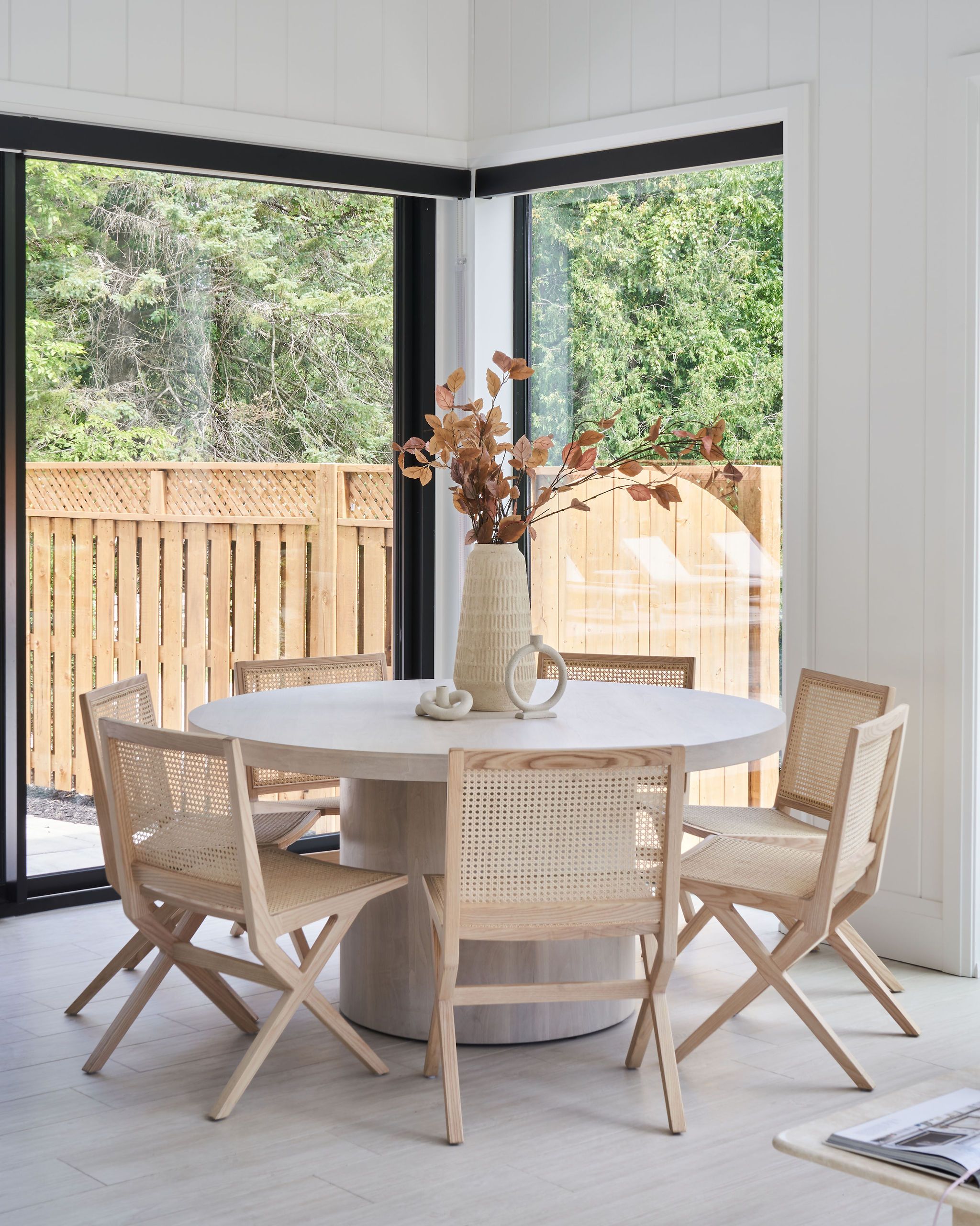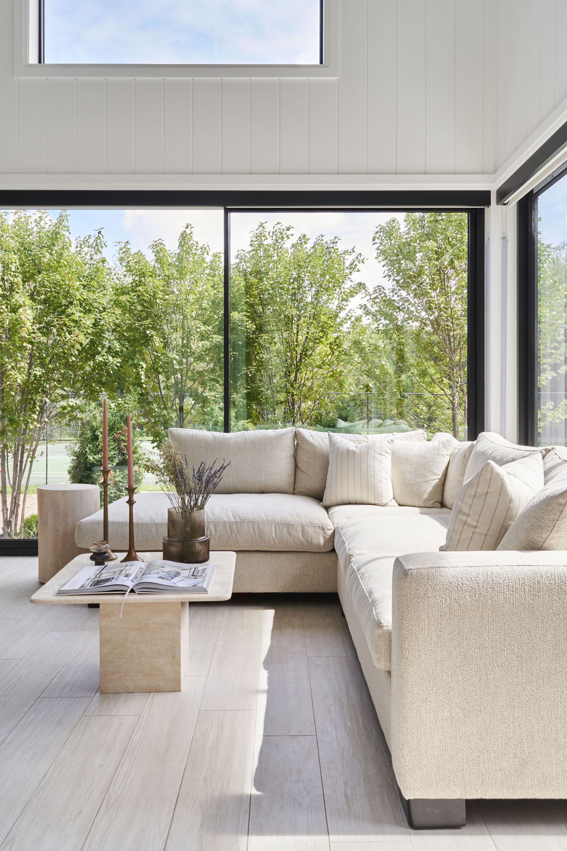 Our vision was to highlight the home’s architectural features by balancing light, airy materials and furnishings against the striking black-framed wrap-around windows, which flood the interiors with natural light. Dark wooden ceiling beams were introduced to enhance the main living areas, that gracefully accentuate the peaked ceilings.