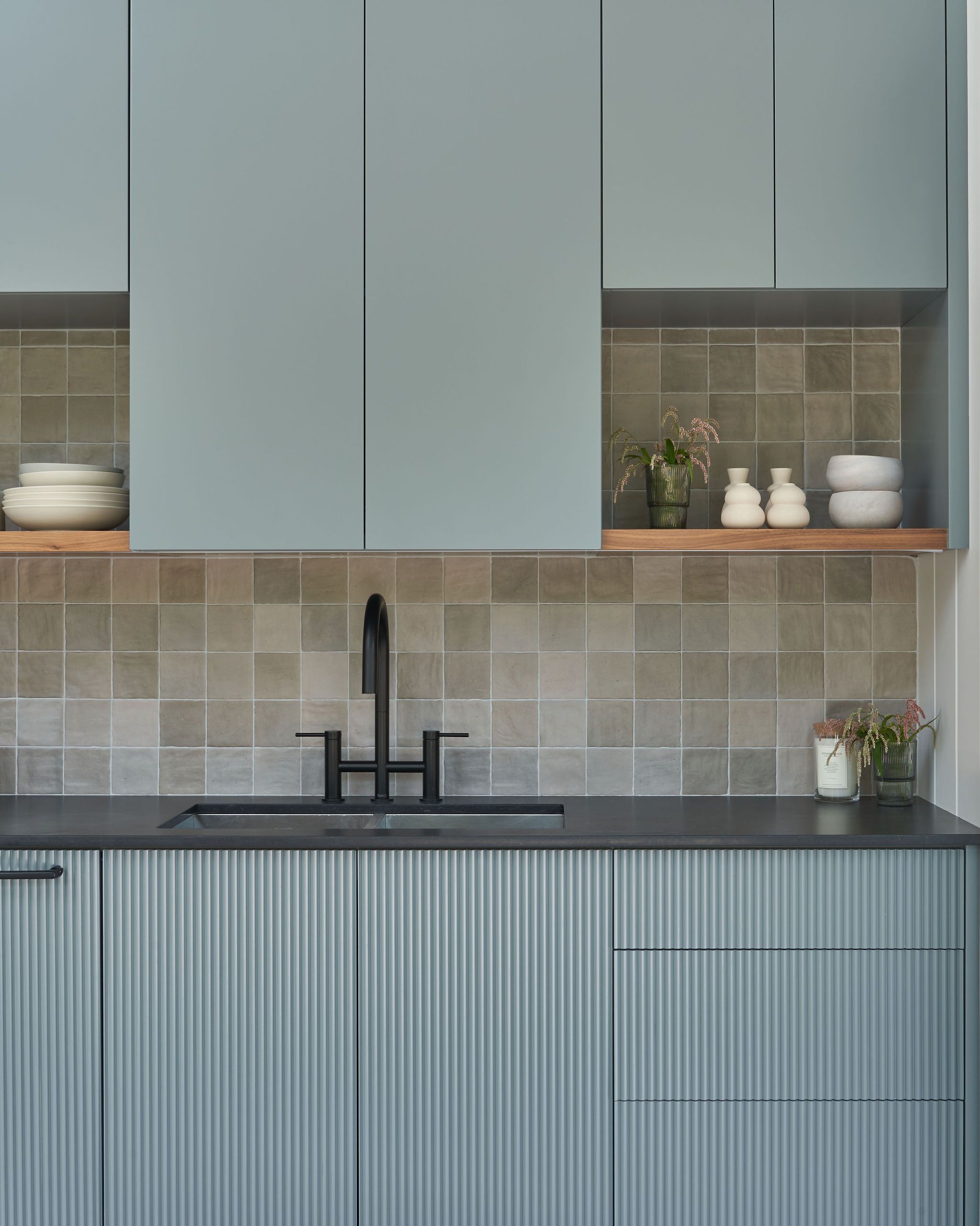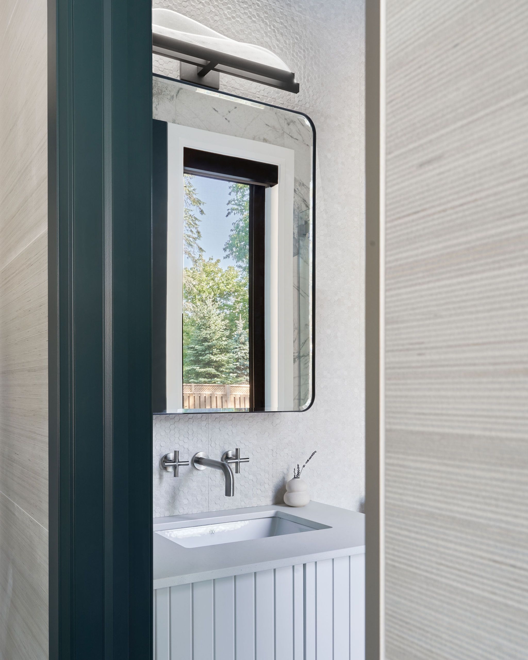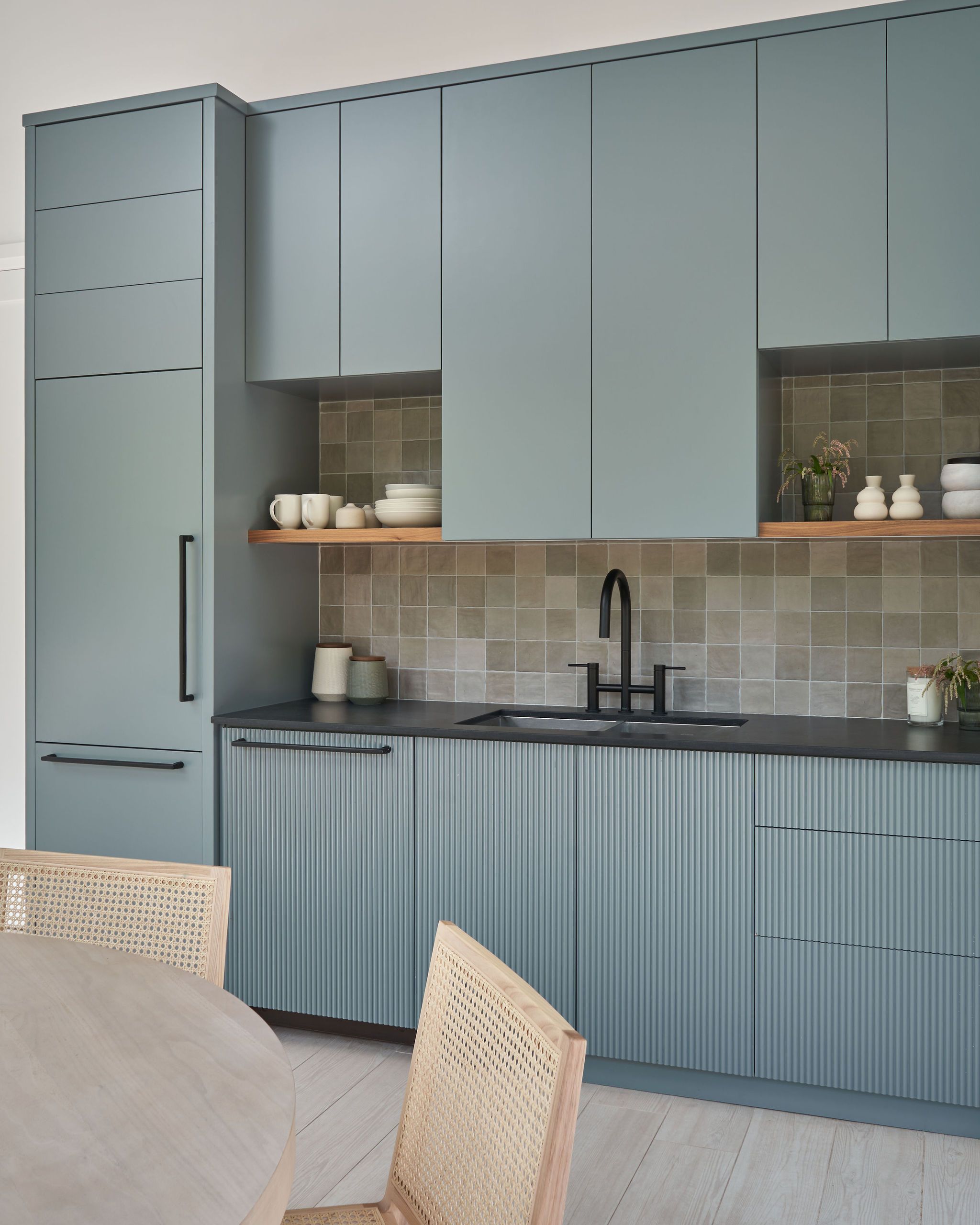 In the kitchen, we infused colour and character with deep green cabinetry, featuring subtle reeded detailing and an organic tile backsplash, creating a vibrant and inviting space to cook. Throughout the home, we curated a diverse mix of pattern and texture, including painted wood paneling, stained woods and textured wall tiles, crafting a visually engaging environment that feels both modern and welcoming.