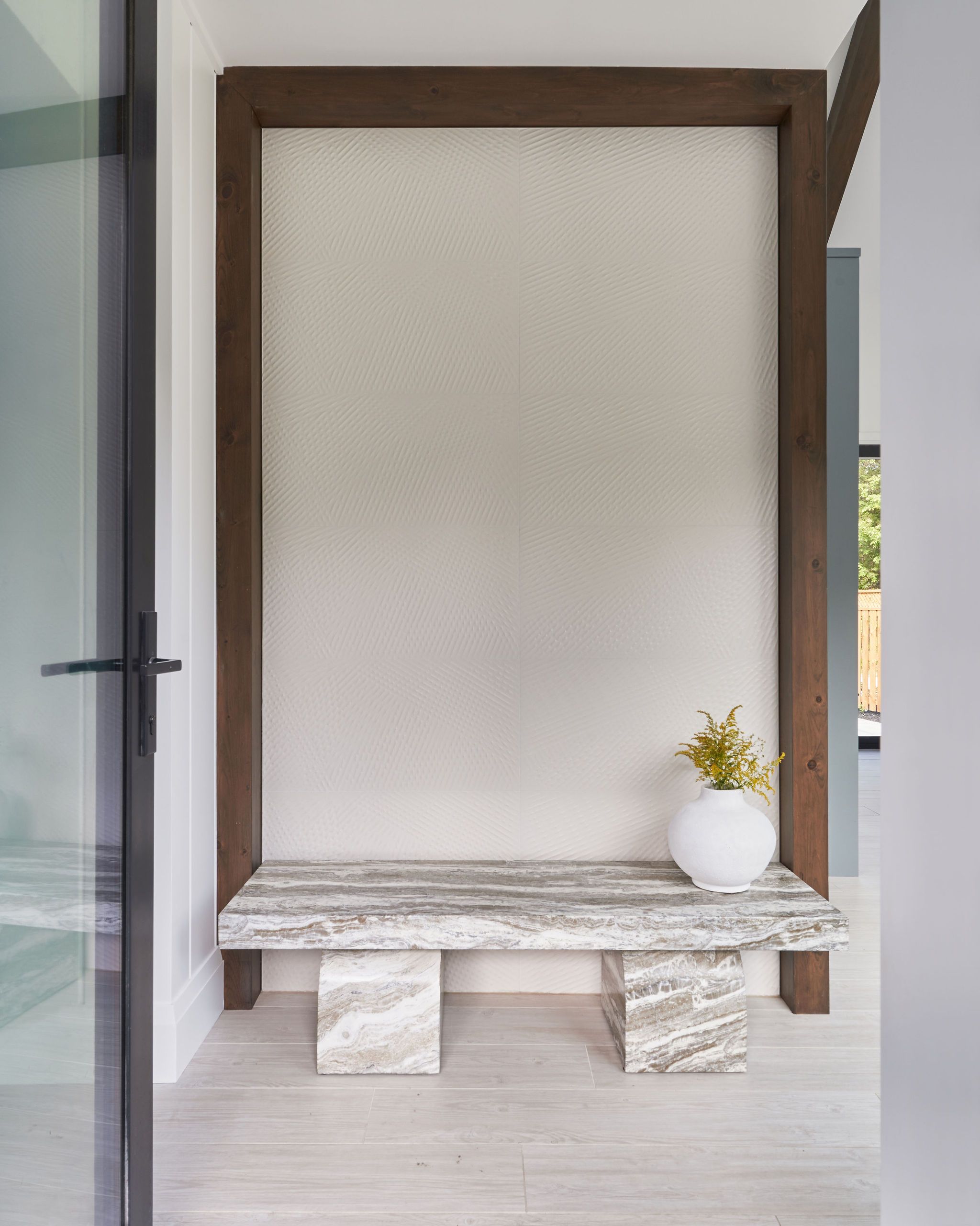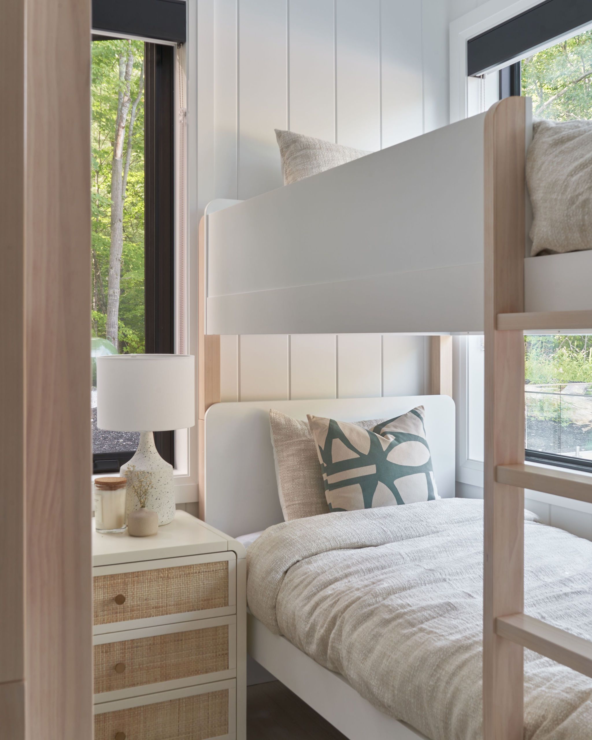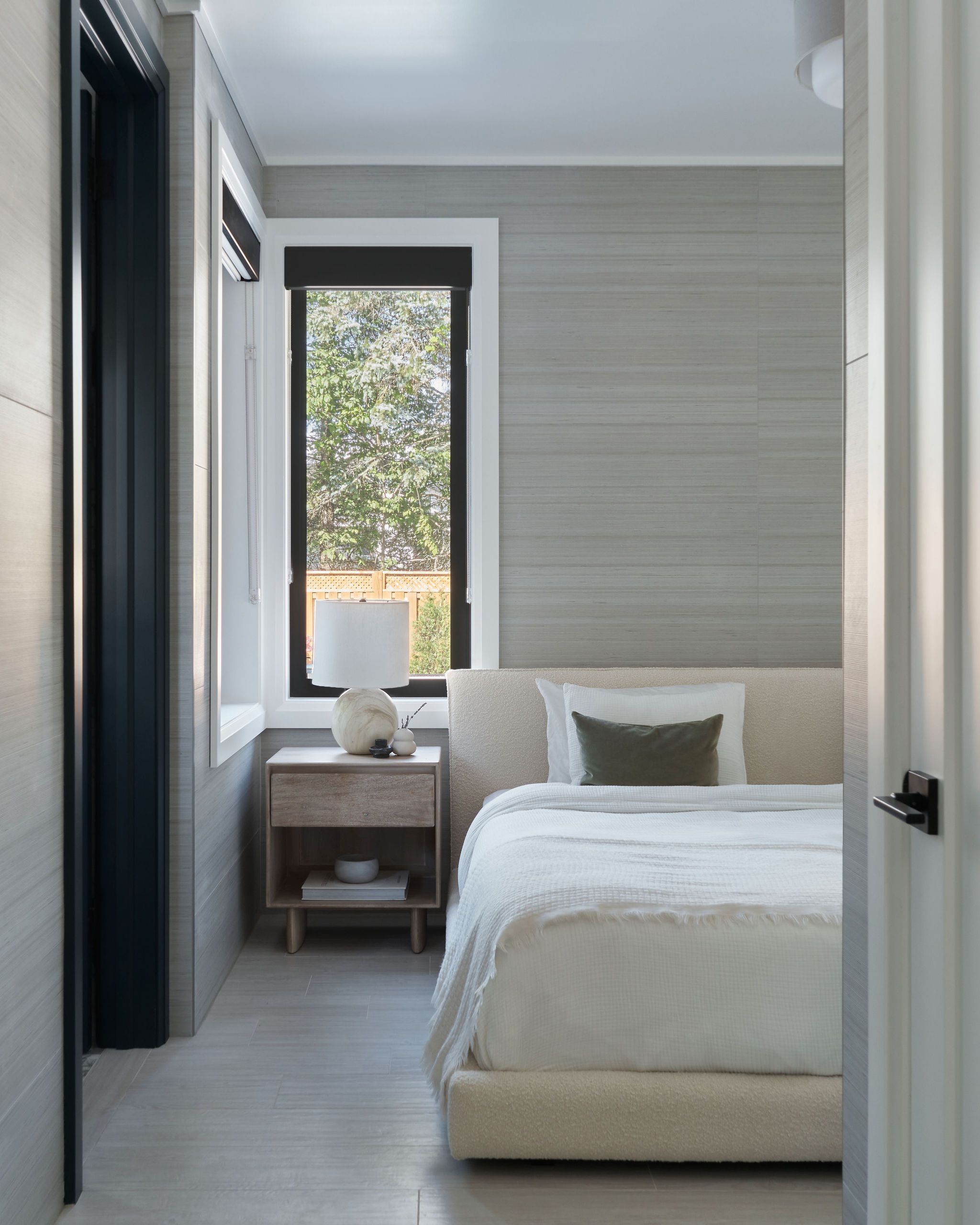 In the kitchen, we infused colour and character with deep green cabinetry, featuring subtle reeded detailing and an organic tile backsplash, creating a vibrant and inviting space to cook. Throughout the home, we curated a diverse mix of pattern and texture, including painted wood paneling, stained woods and textured wall tiles, crafting a visually engaging environment that feels both modern and welcoming.