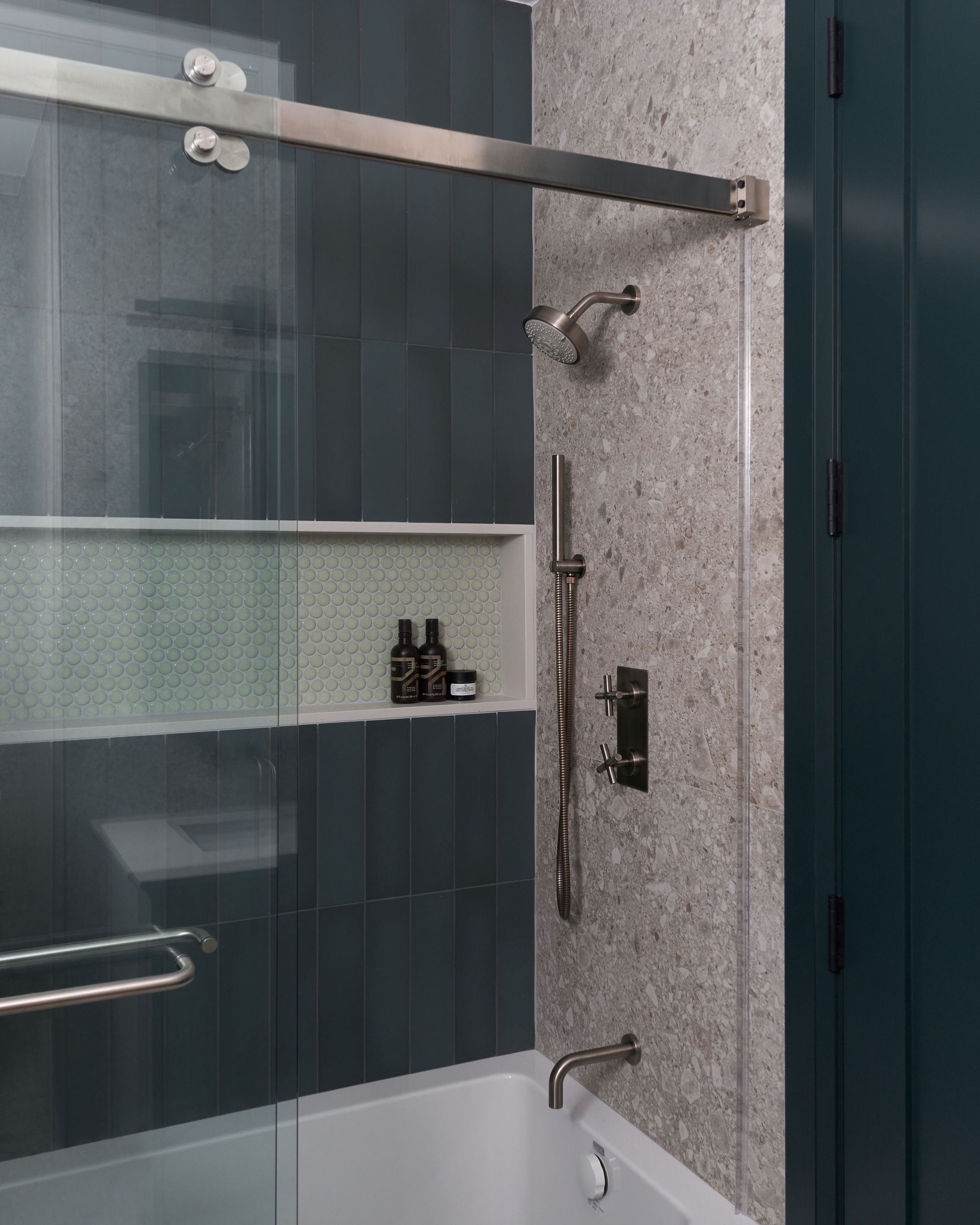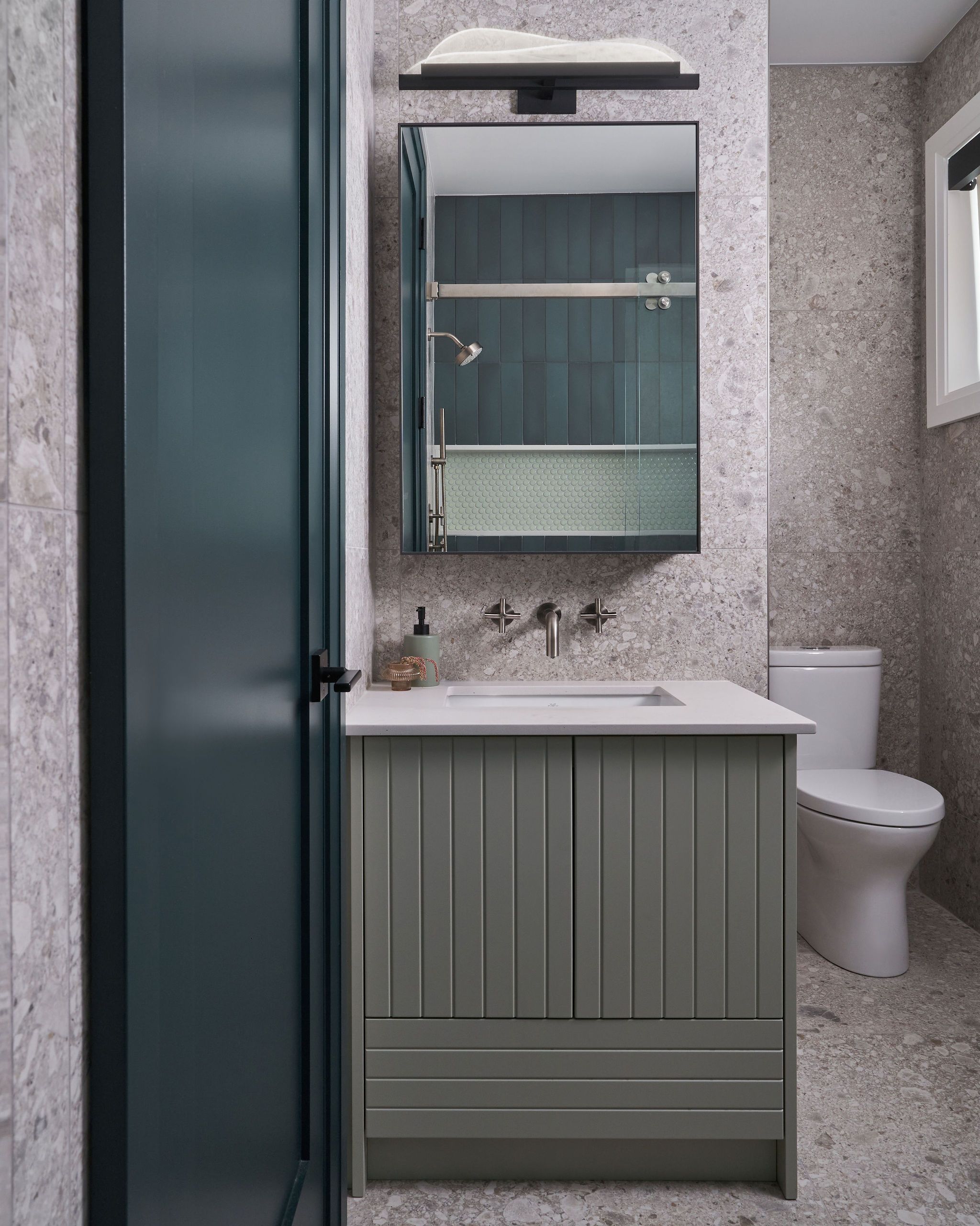 The bathrooms showcase a variety of lush green tones and playful patterns in the tiles and vanities, while hints of green accentuate the door/frame details, providing a cohesive and dynamic design flow. Our furnishings prioritize comfort and style, with a focus on natural materials and soft, inviting textiles that invite relaxation and ease.