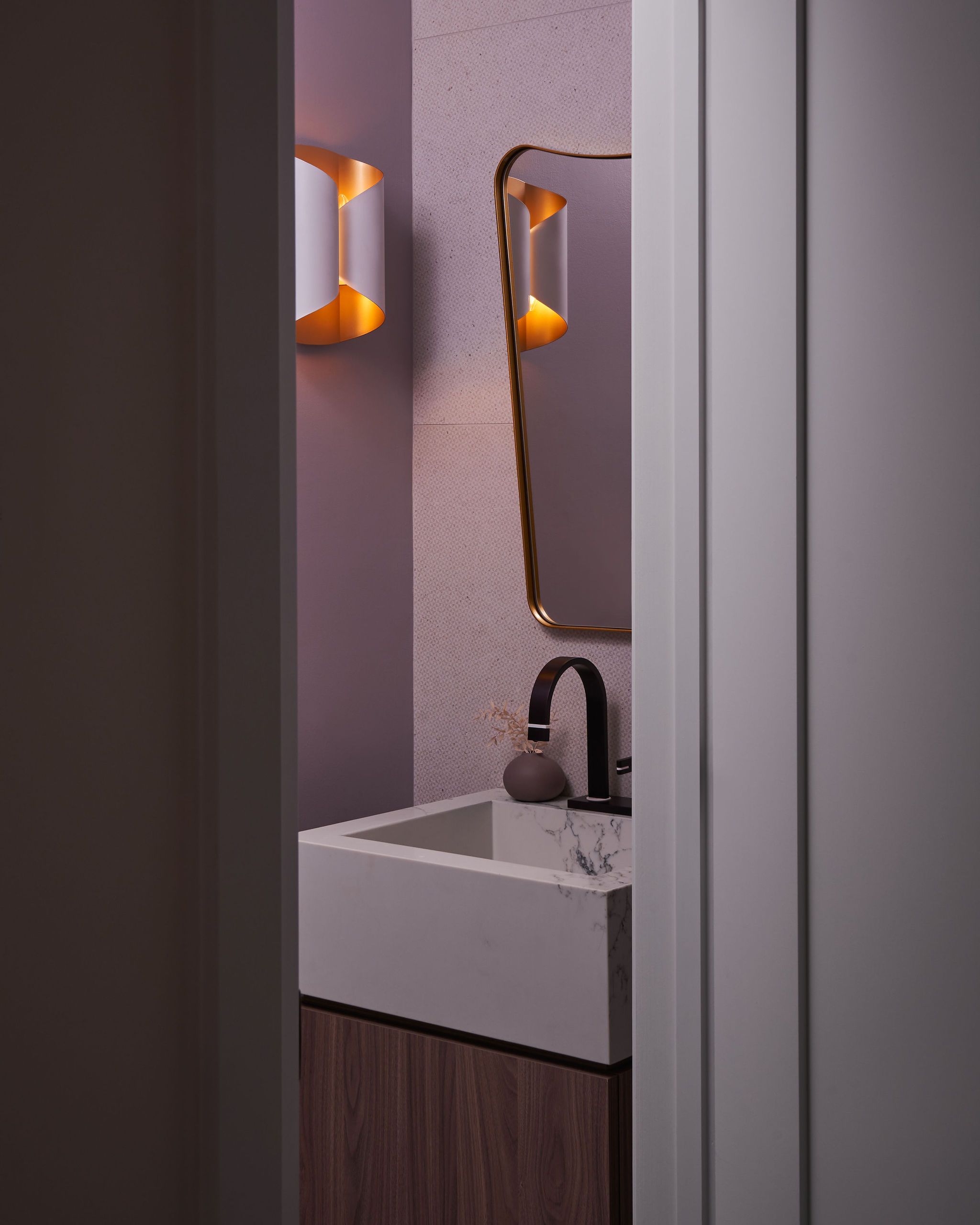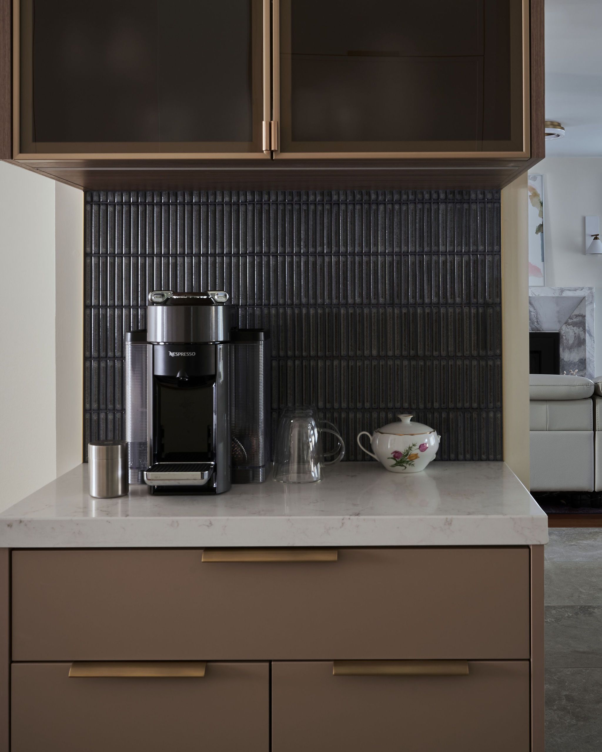 A cozy coffee nook connects the kitchen and dining room, featuring matchstick tile, bronze glass cabinet doors, and brass framing for an added touch of charm and glamour. The powder room was reimagined with a moody mauve palette and an integrated stone sink with purple veining, complemented by a bespoke burgundy faucet, textured tiles, and sculptural sconces, bringing warmth, richness, and personality to this intimate space.