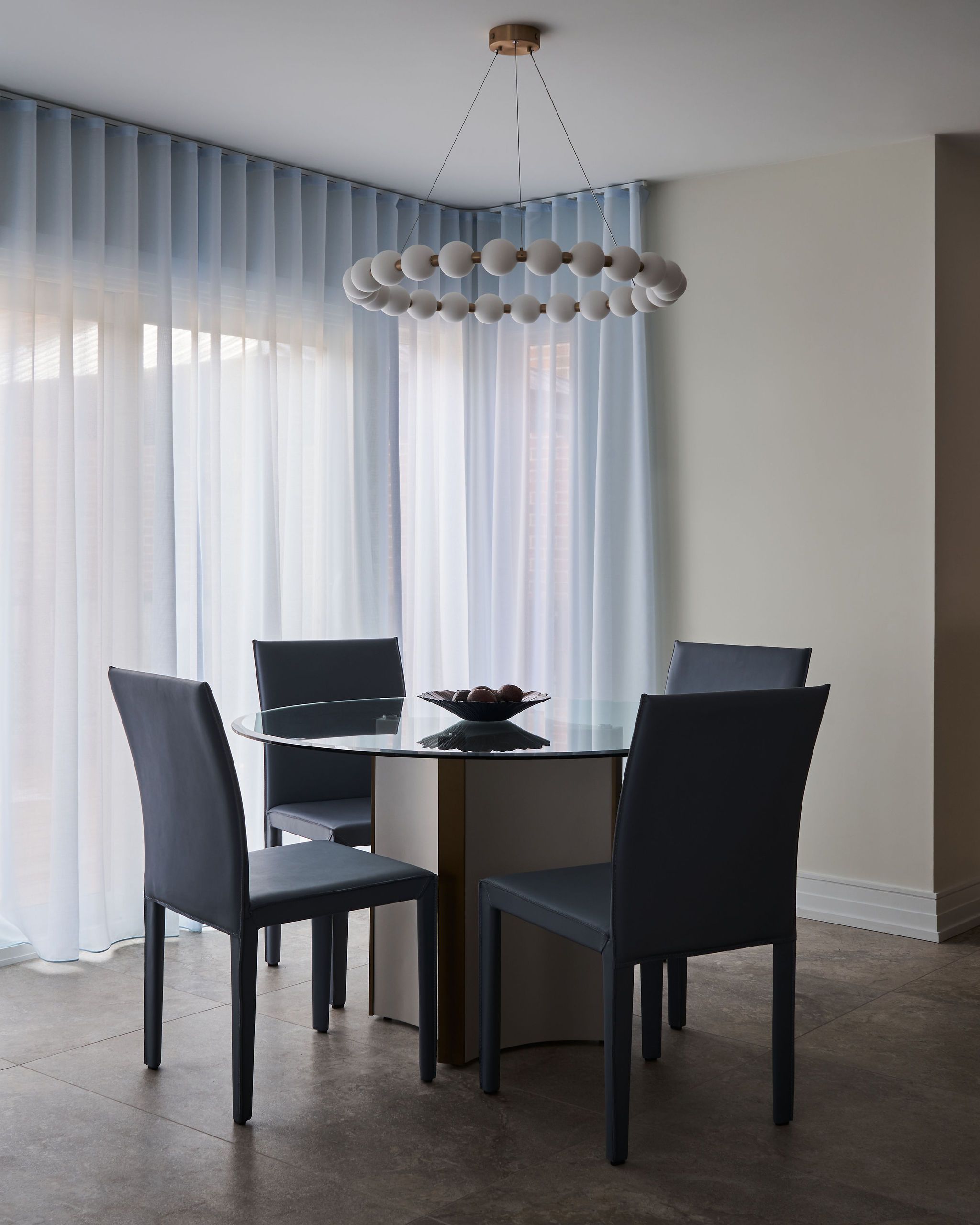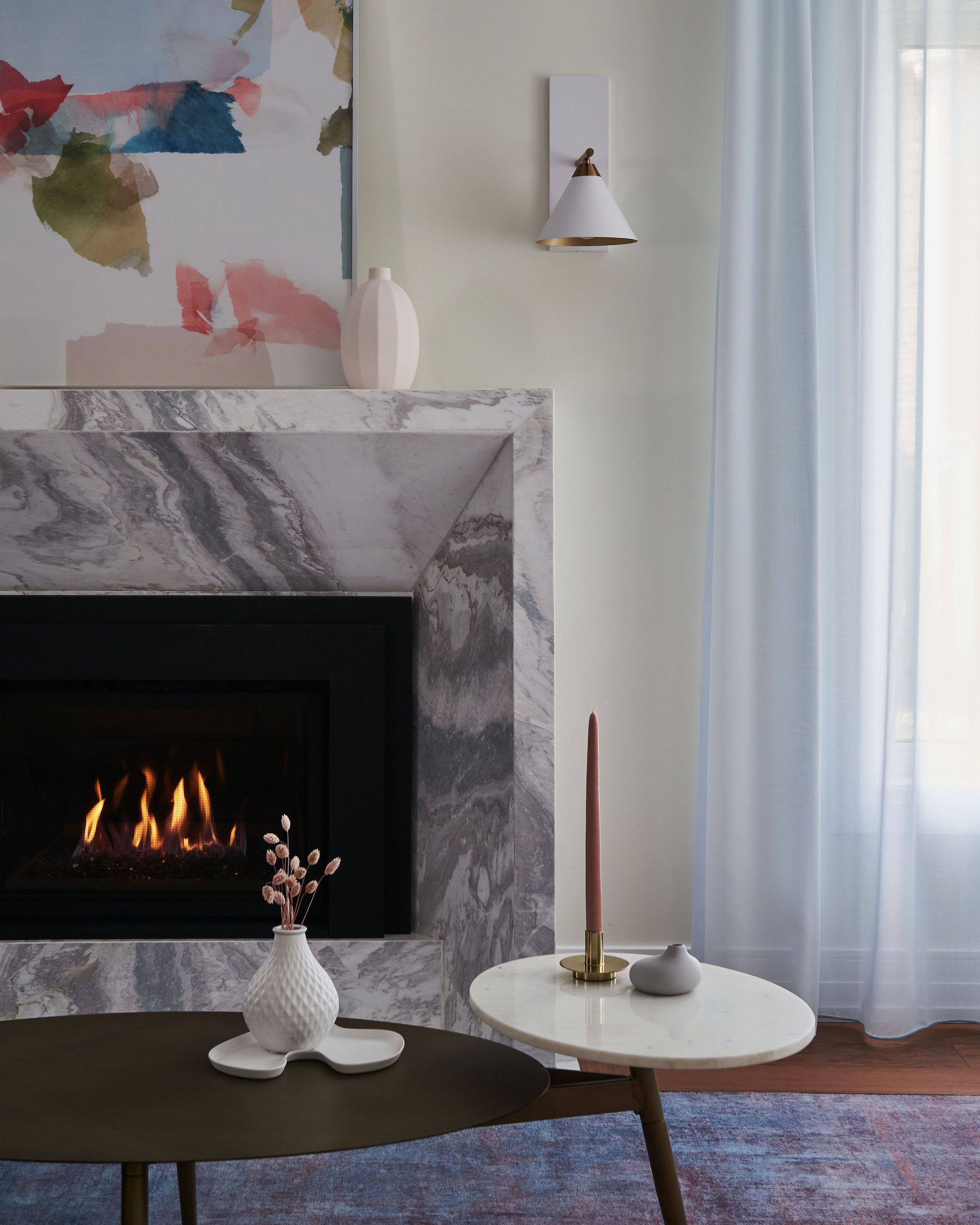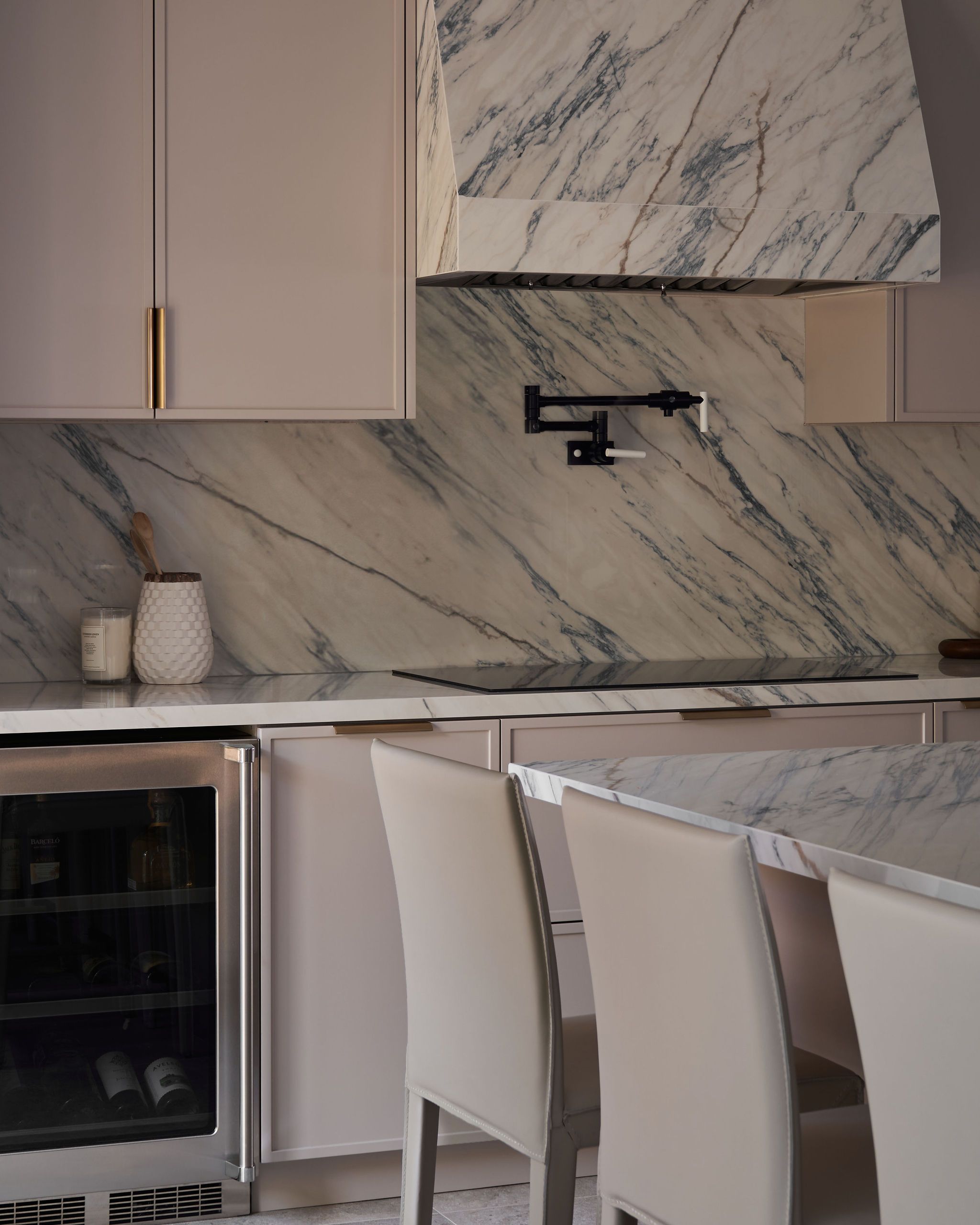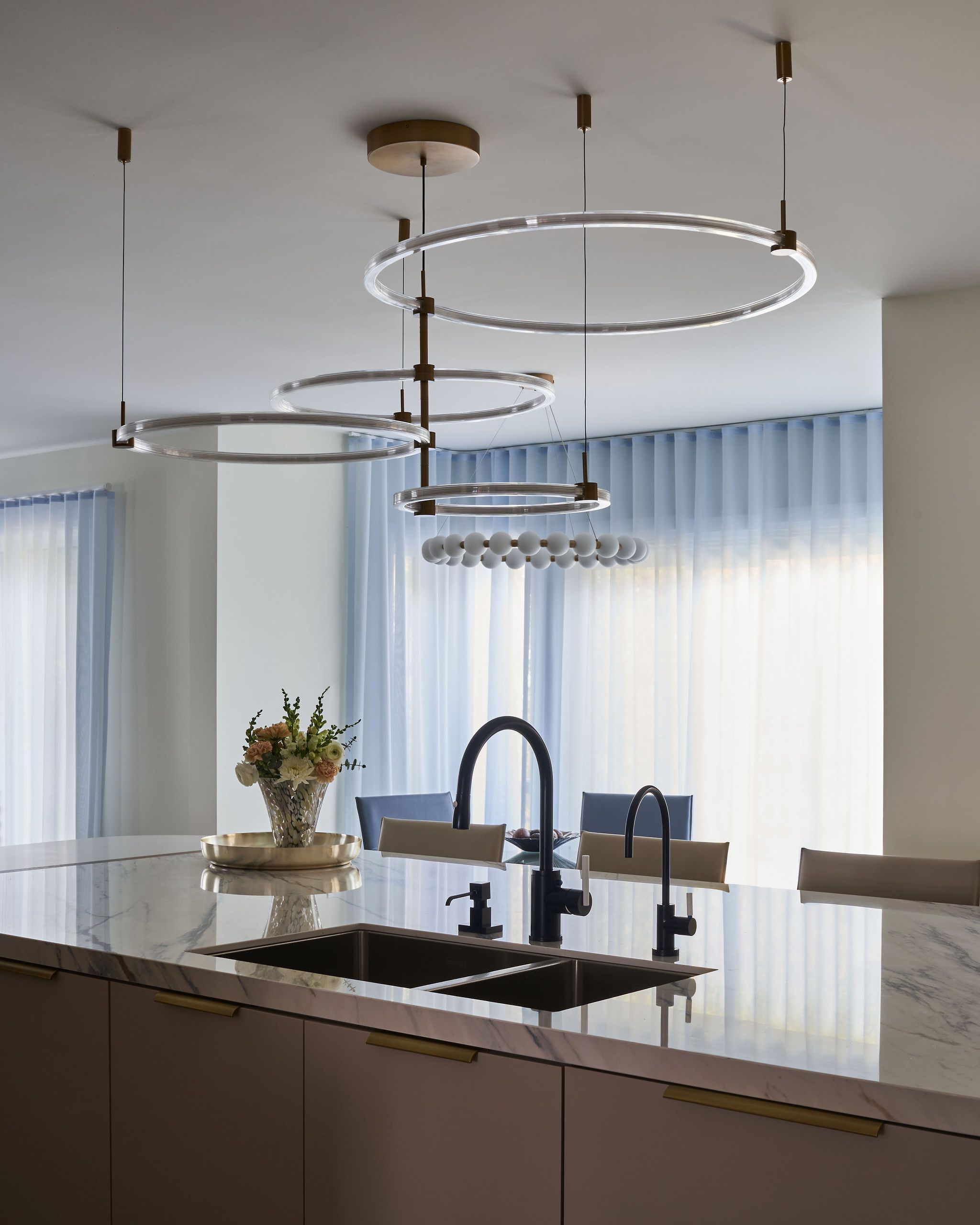Stone countertops with striking blue veining continue seamlessly into the backsplash, paired with a custom angled hood fan and a curved stone island detail for added sculptural interest. The island, illuminated by a multi-ring chandelier, anchors the kitchen with softness and sophistication. Throughout the kitchen and adjoining living areas, custom navy faucets, airy light-blue drapery, and marble fireplace accents create cohesion and an inviting, elevated atmosphere.