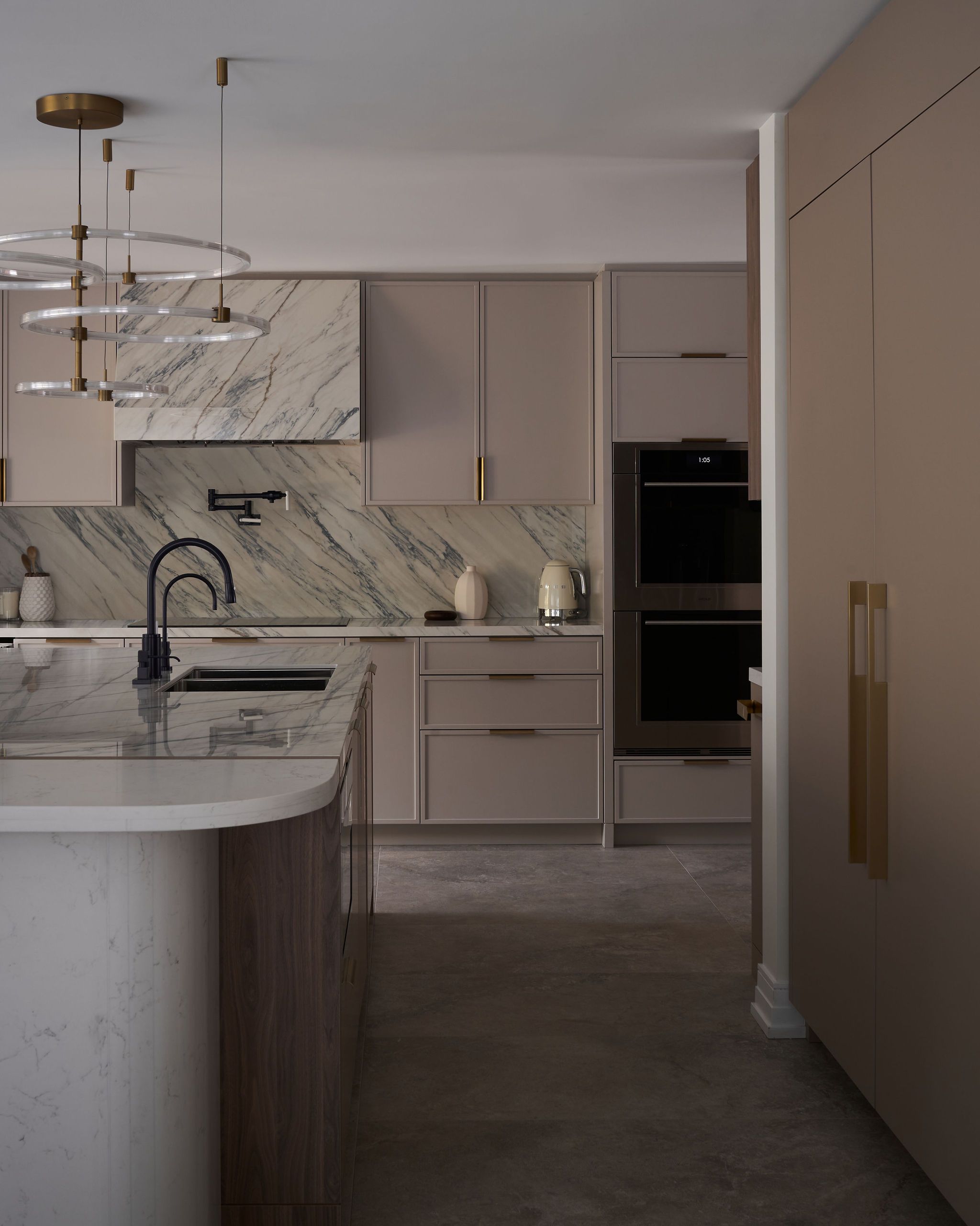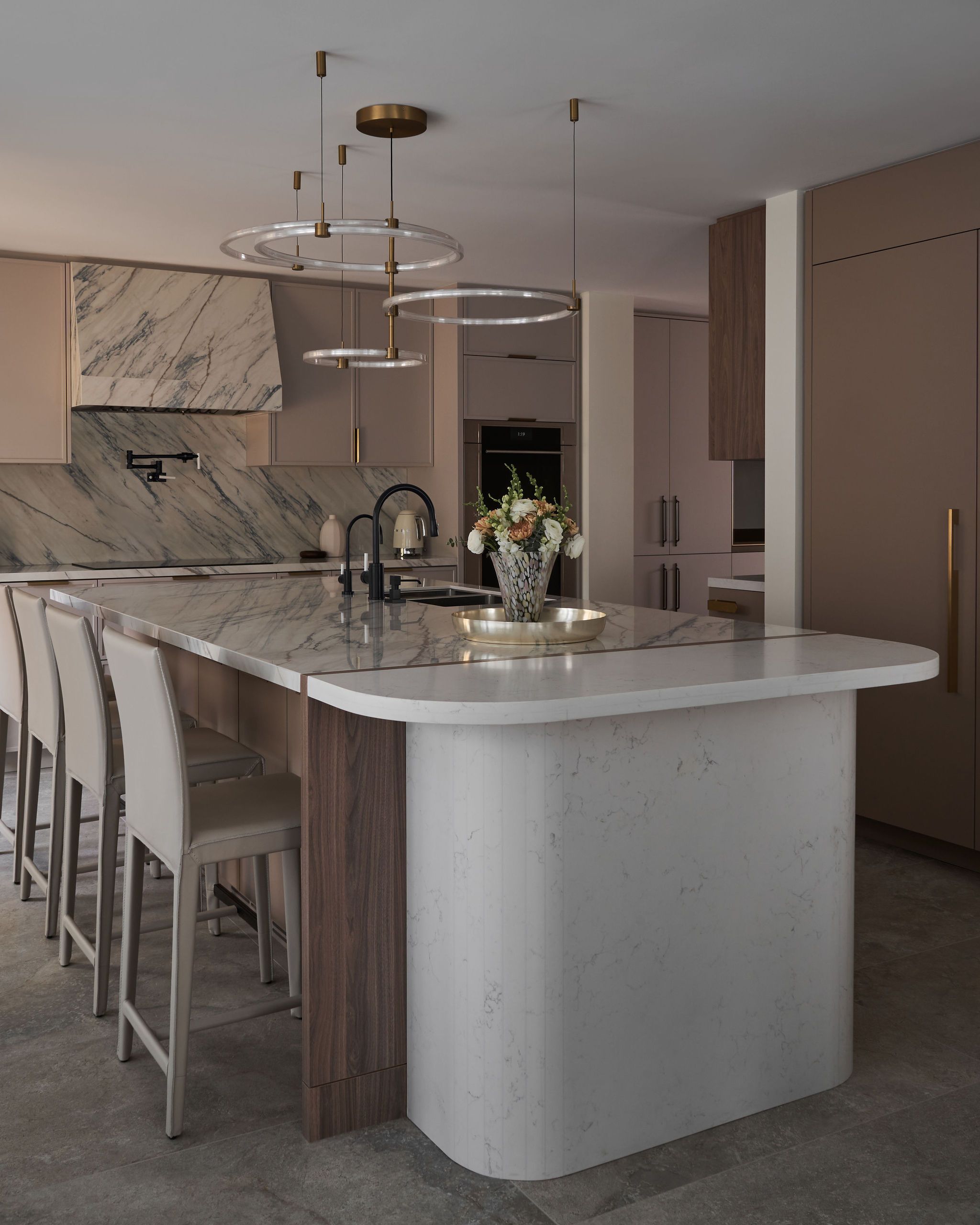 Embracing a warm, earthy palette accented with soft mauve and light blues, the new kitchen balances elegance with everyday practicality. Designed around the clients’ lifestyle, it features double wall ovens, an induction cooktop, integrated column fridge and freezer units, an under-counter wine fridge, and a microwave drawer. Custom cabinetry in layered earthy tones, enriched with subtle wood accents, brings dimension and warmth to the space.