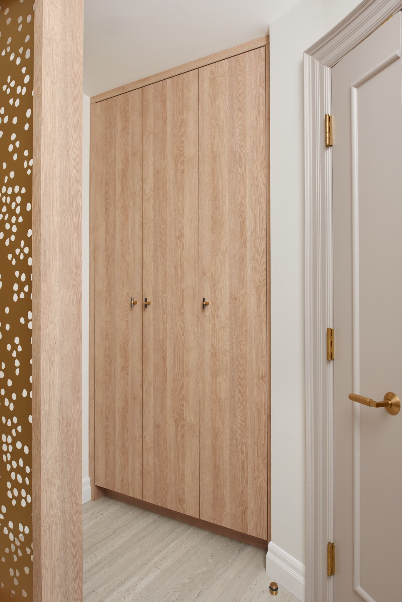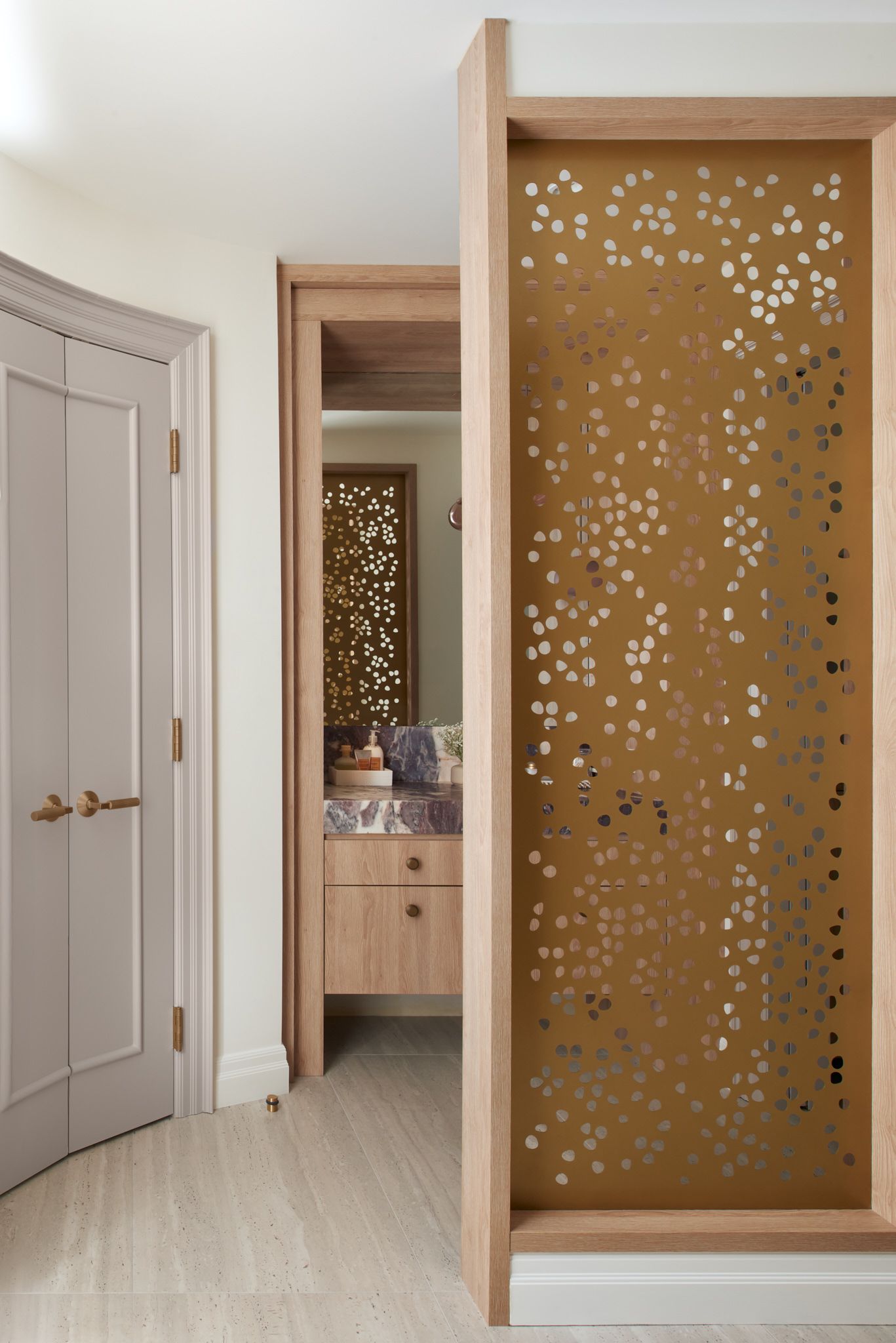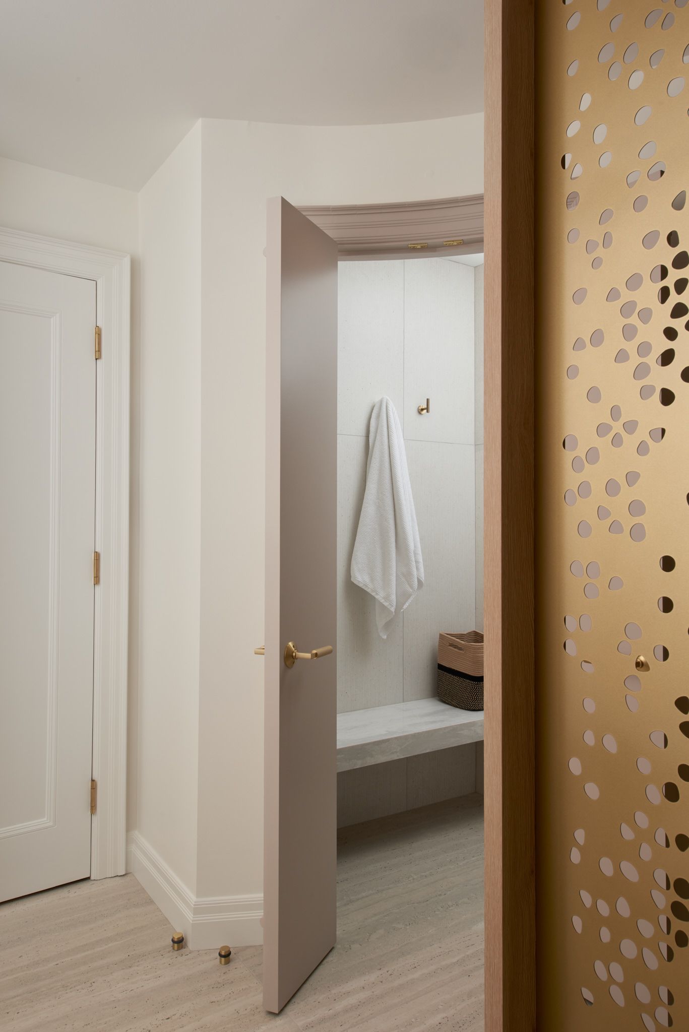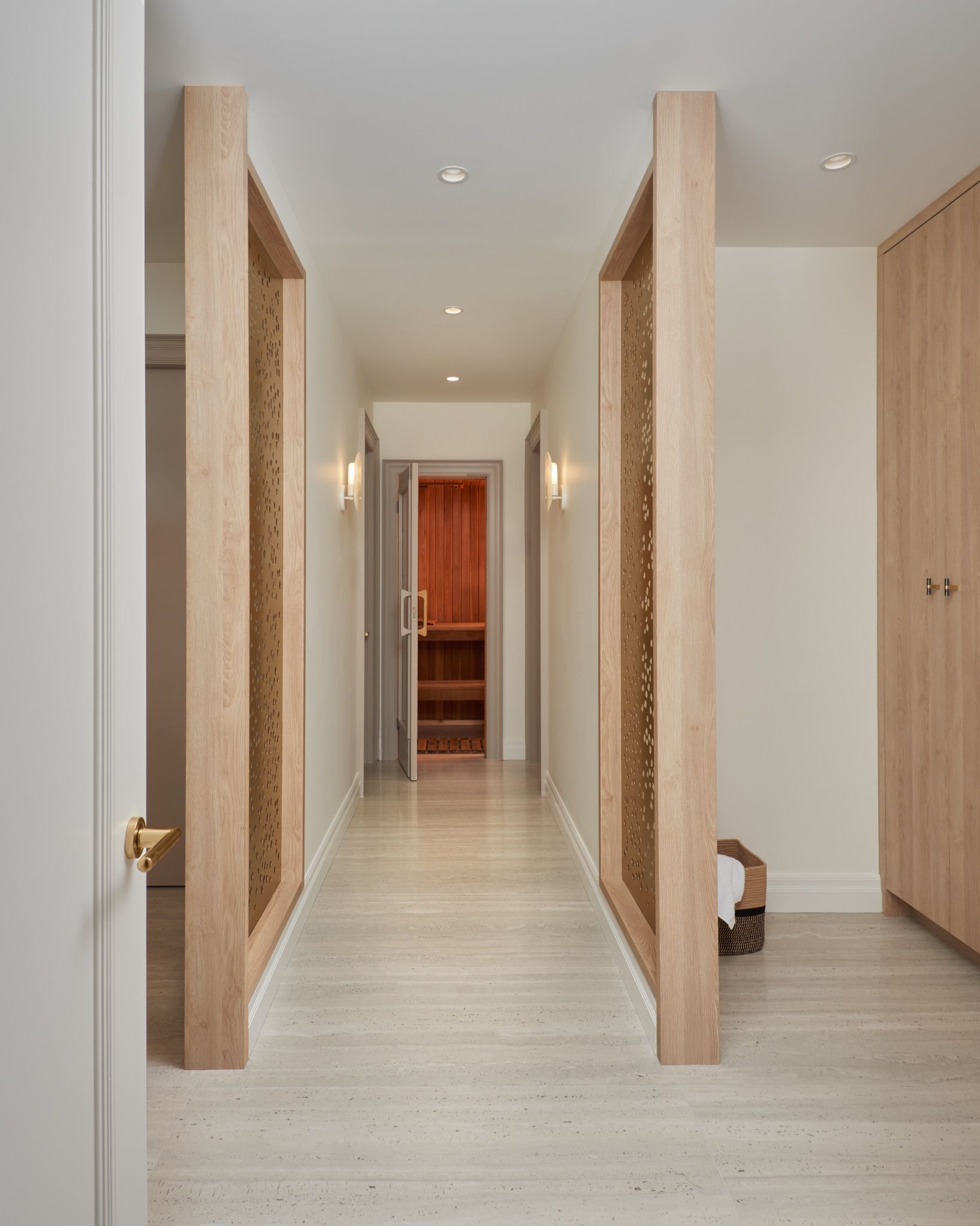 The redesigned Toronto home spa now features two private change rooms, a custom vanity area, sauna, spacious walk-in shower, full bathroom, laundry, and storage space. Custom architectural screens were introduced to define zones within the open-concept layout, offering privacy while maintaining an elegant and airy feel. Material selection was central to the transformation.