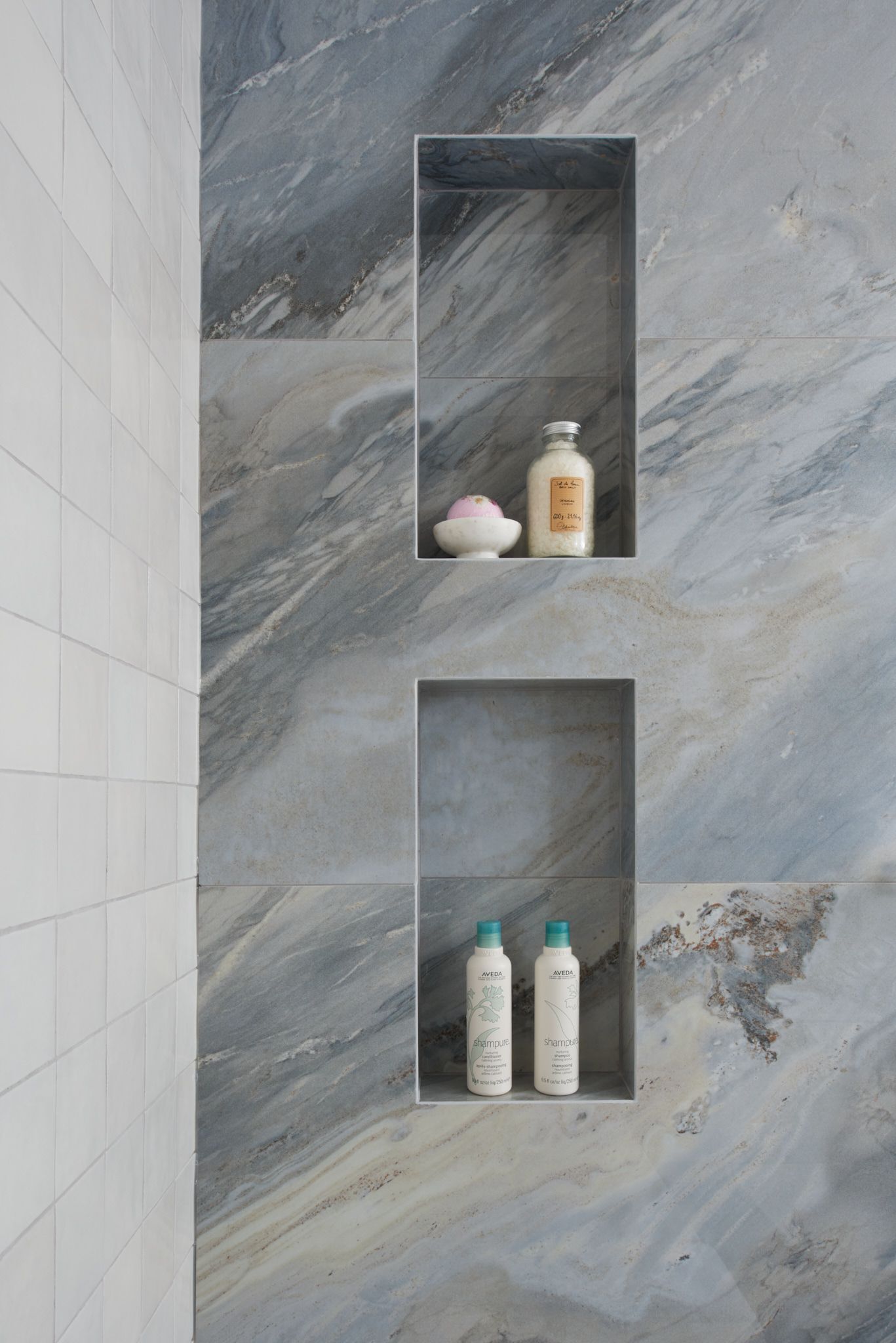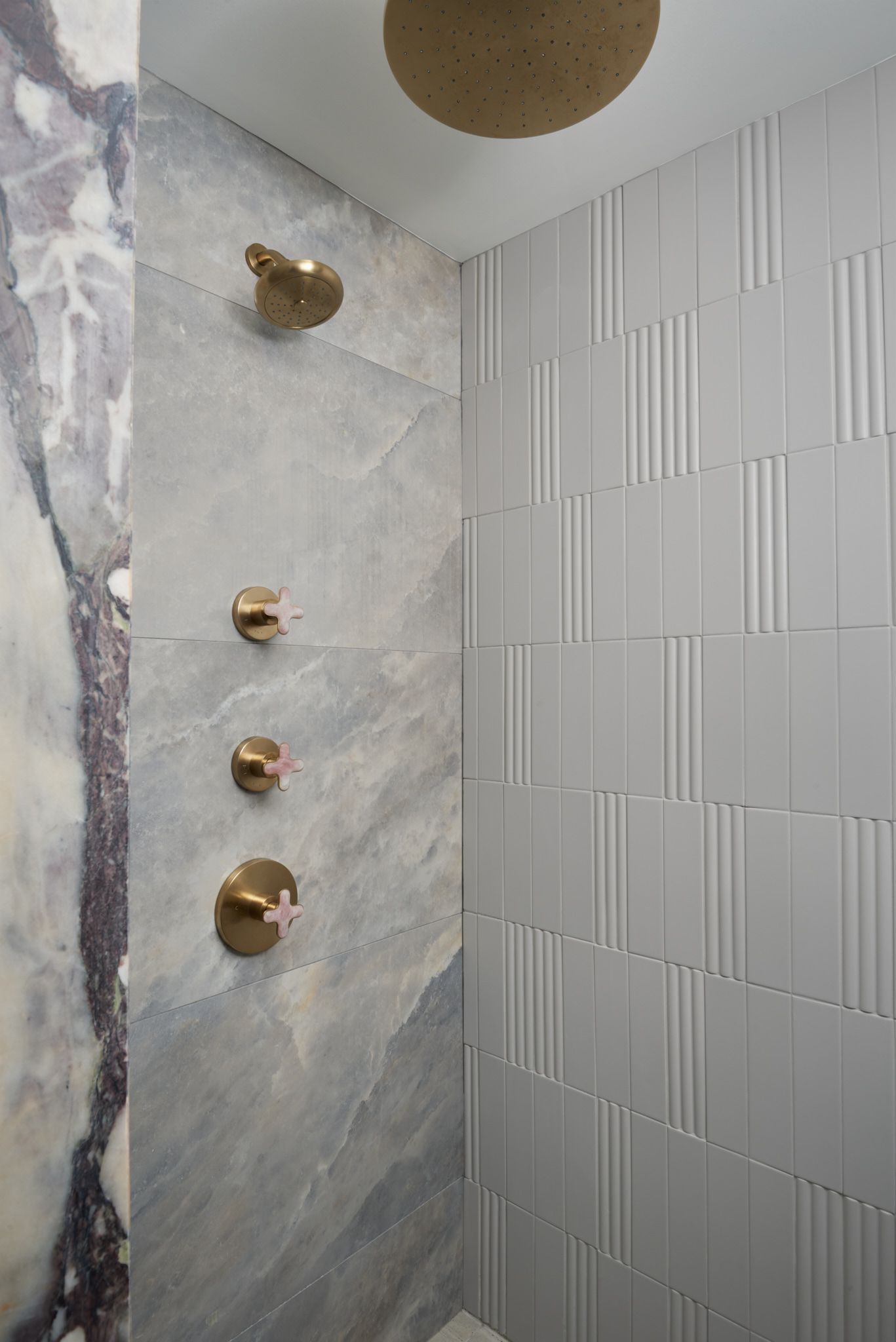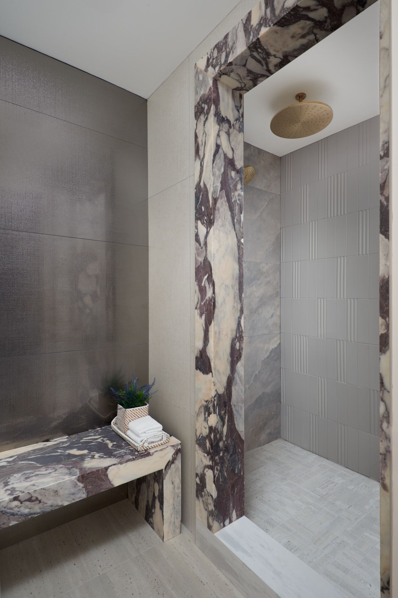 The dramatic Calacatta Viola marble adds organic luxury to the main vanity and shower details. Complementary large-format porcelain tiles—carefully selected to mimic natural travertine—extend throughout the spa, blending a timeless aesthetic with low-maintenance durability. Design details were elevated with Kallista plumbing fixtures, including marble insets in the shower and vibrant turquoise accents that add a refined, playful energy to the bathroom space.