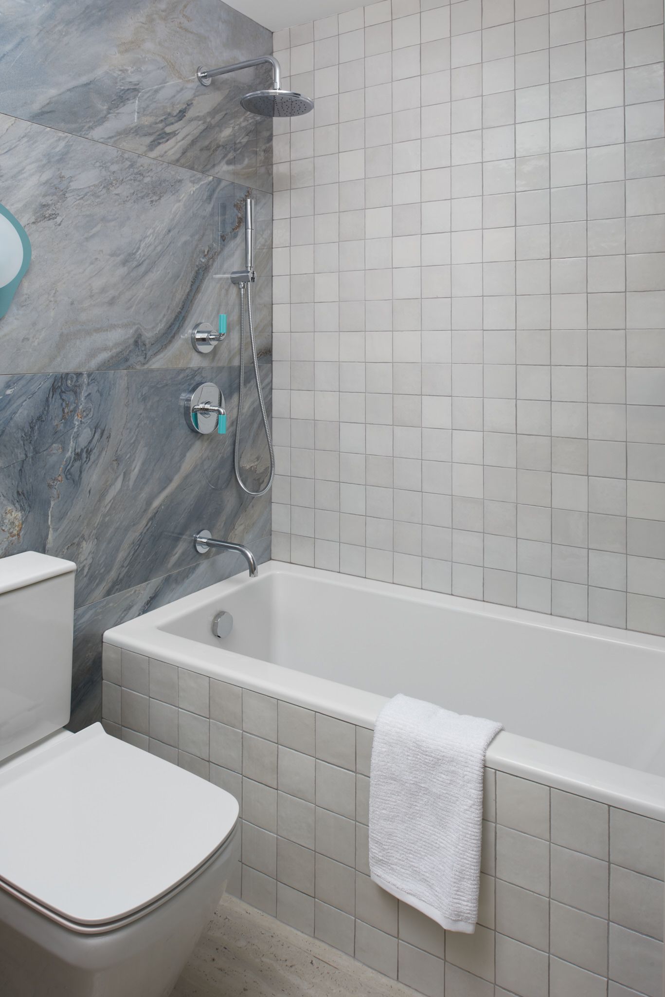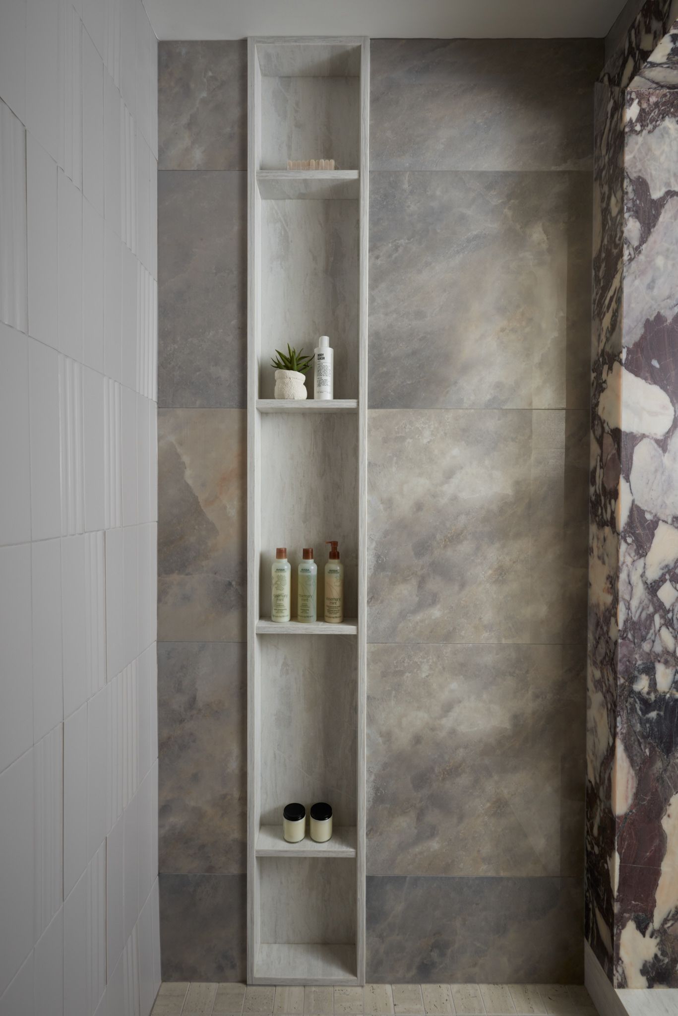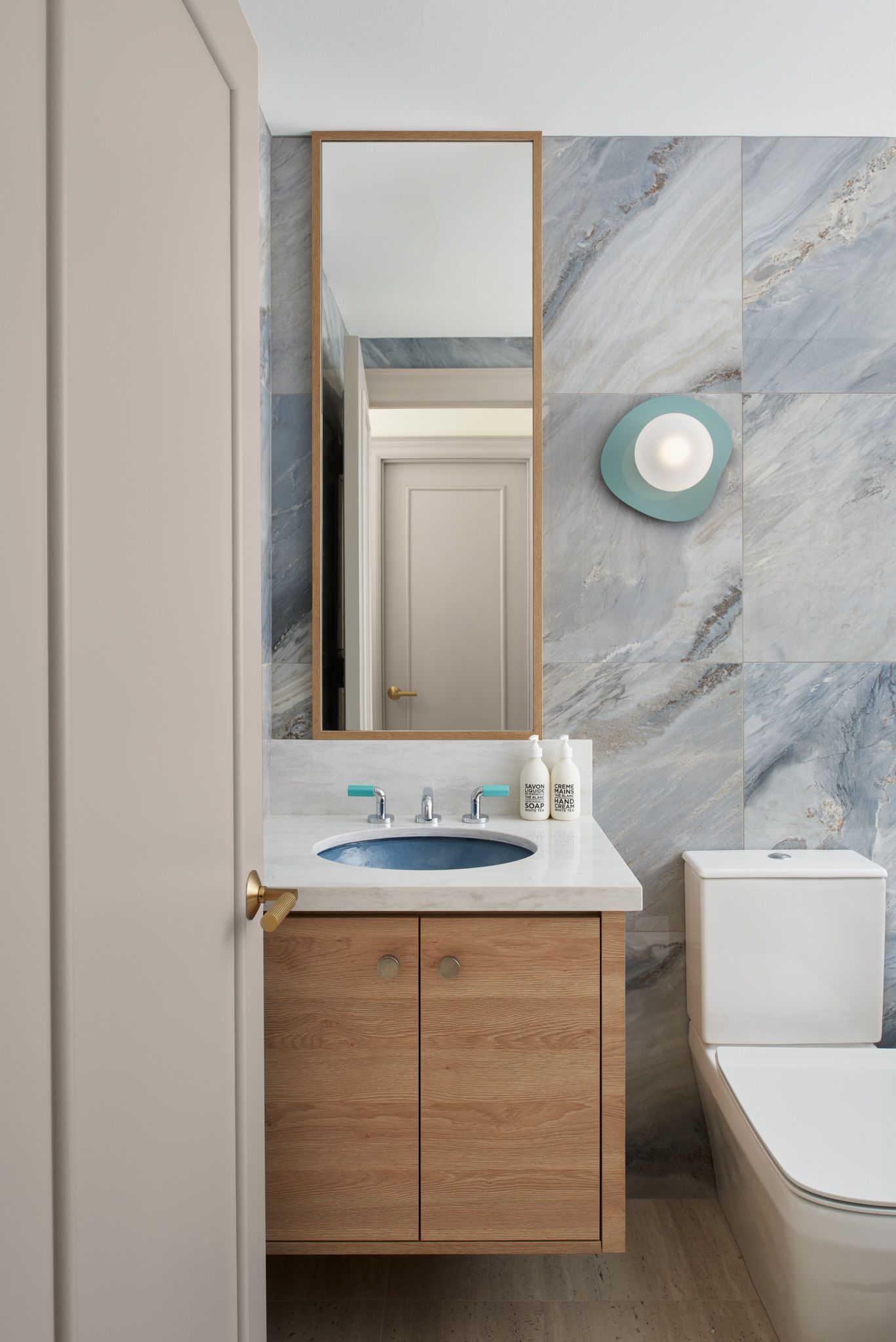 The dramatic Calacatta Viola marble adds organic luxury to the main vanity and shower details. Complementary large-format porcelain tiles—carefully selected to mimic natural travertine—extend throughout the spa, blending a timeless aesthetic with low-maintenance durability. Design details were elevated with Kallista plumbing fixtures, including marble insets in the shower and vibrant turquoise accents that add a refined, playful energy to the bathroom space.